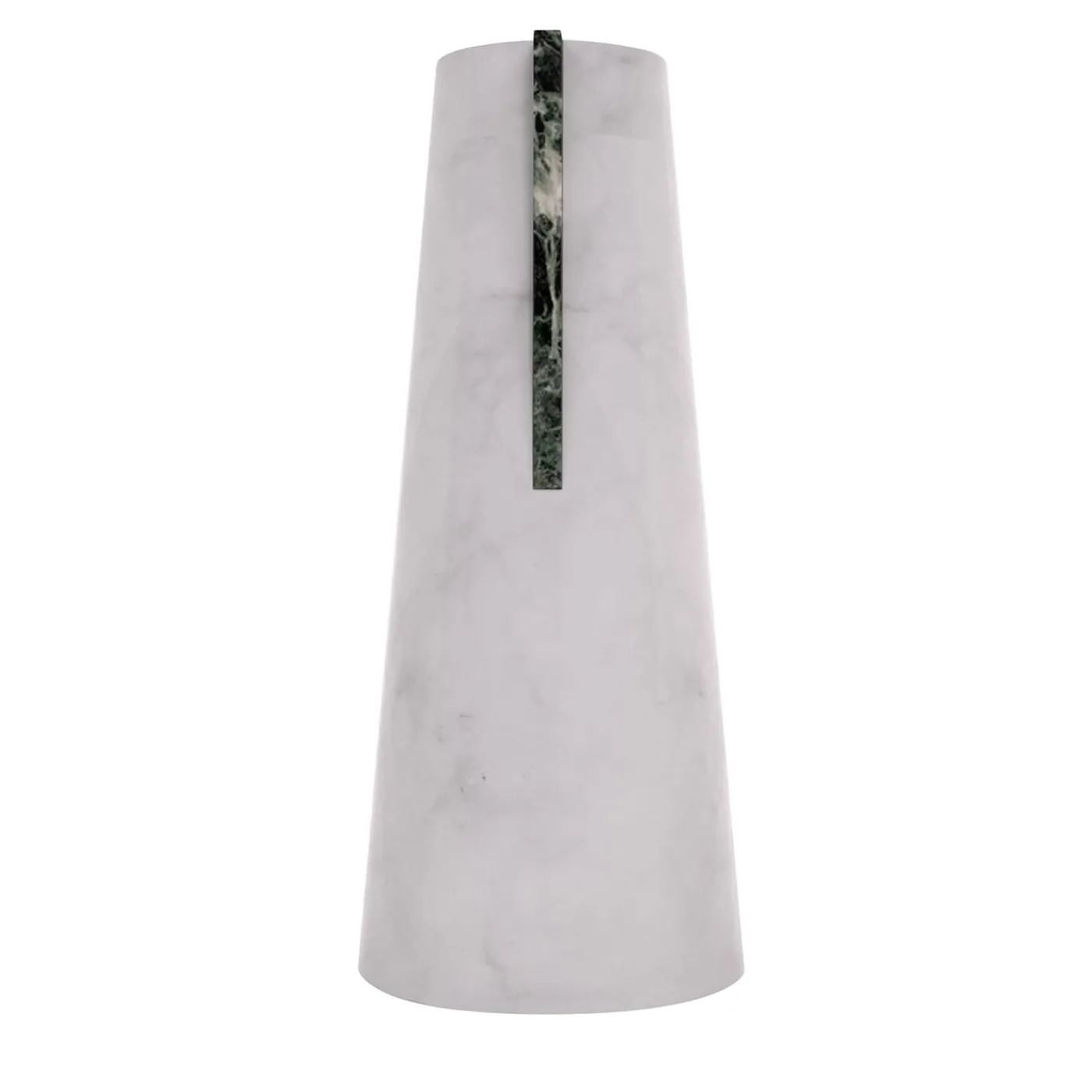 Design di inconfondibile ispirazione contemporanea, questo luminoso vaso in marmo vanta un affascinante contrasto di tonalità e trame. Il corpo tronco-conico in marmo bianco di Carrara è arricchito da un inserto a contrasto in marmo Verde Alpi che enfatizza ulteriormente il fascino geometrico generale. Realizzato su ordinazione e personalizzabile, ogni pezzo è interamente unico.