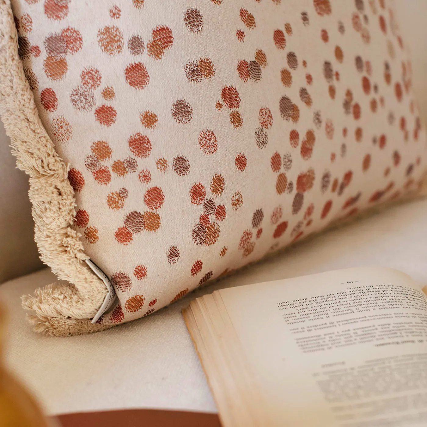 Grande cuscino decorativo di lusso in Caramello e Marrone 50x50cm in tessuto jacquard 100% cotone con bordo sfrangiato. Il suo esclusivo motivo tessile ricorda la tradizionale tecnica del macchiato pugliese, emblematica del marchio come celebrazione della gioiosa spontaneità della natura. Questo raffinato cuscino è realizzato interamente a mano in Italia e tessuto sugli antichi telai di una storica tessitura pugliese nel rispetto della storia, della natura e delle persone.