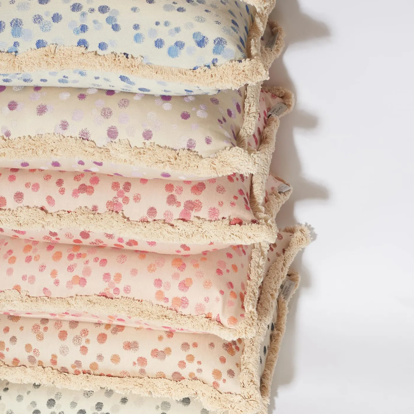 Grande cuscino decorativo di lusso in Rosa e Corallo 50x50cm in tessuto jacquard 100% cotone con bordo sfrangiato. Il suo esclusivo motivo tessile ricorda la tradizionale tecnica del macchiato pugliese, emblematica del marchio come celebrazione della gioiosa spontaneità della natura. Questo raffinato cuscino è realizzato interamente a mano in Italia e tessuto sugli antichi telai di una storica tessitura pugliese nel rispetto della storia, della natura e delle persone.