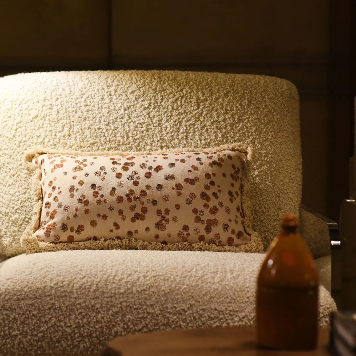 Piccolo cuscino decorativo di lusso in caramello e marrone 30x50cm in tessuto jacquard 100% cotone con bordo sfrangiato. Il suo esclusivo motivo tessile ricorda la tradizionale tecnica del macchiato pugliese, emblematica del marchio come celebrazione della gioiosa spontaneità della natura. Questo raffinato cuscino è realizzato interamente a mano in Italia e tessuto sugli antichi telai di una storica tessitura pugliese nel rispetto della storia, della natura e delle persone.