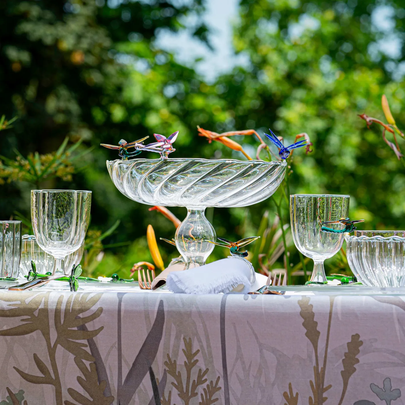 Sapientemente realizzato a mano da artigiani veneziani, questo piatto da frutta in vetro trasparente a righe presenta tre libellule multicolore nei colori blu intenso, bordeaux e rosa, verde e giallo sorbetto, delicatamente appoggiate sul bordo. Creato in collaborazione con Summerill & Bishop London, simboleggia equilibrio e tranquillità , fondendo l’arte con la raffinata artigianalità italiana. Ogni pezzo è unico e celebra l’eleganza della lavorazione del vetro.