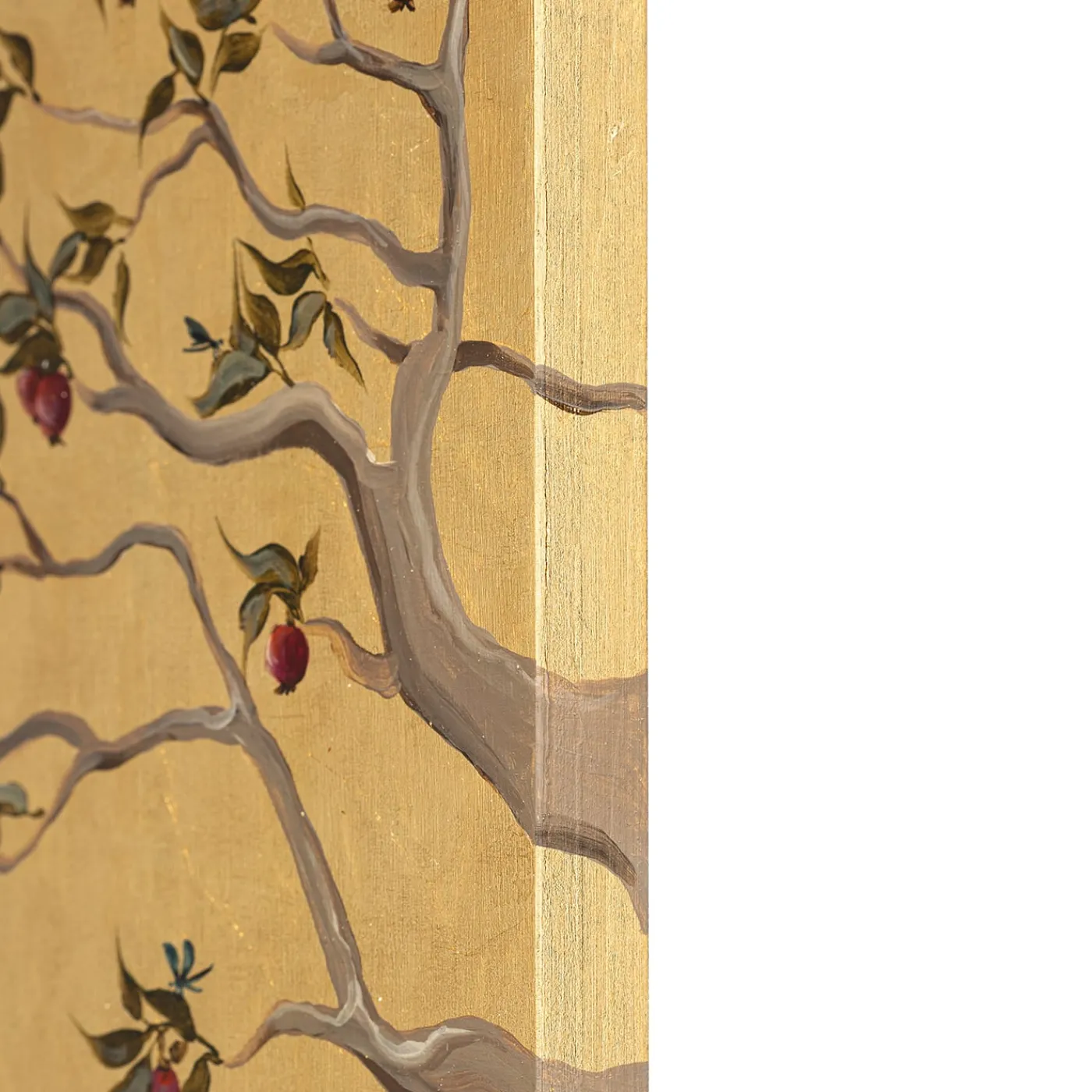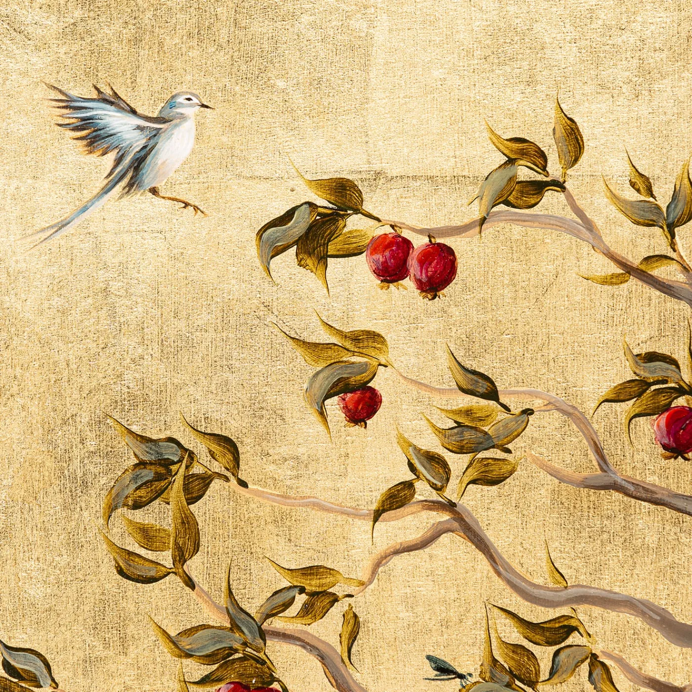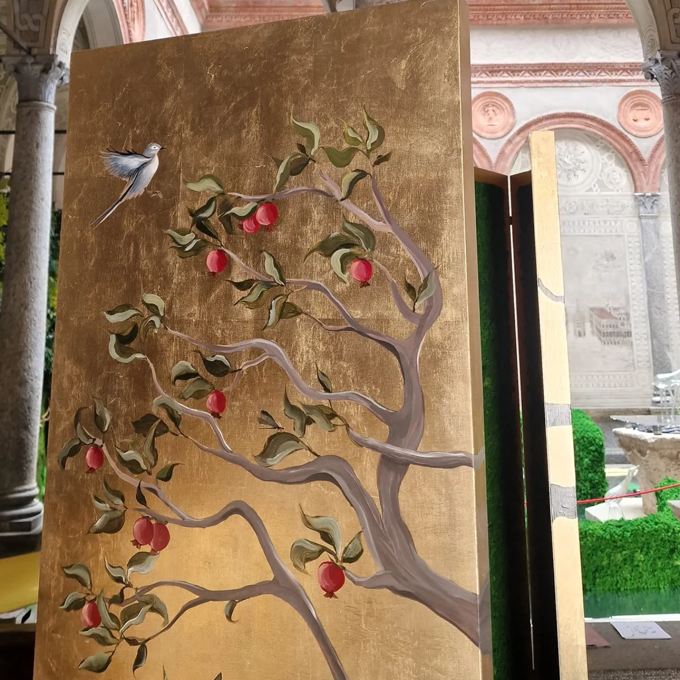 Giù in Giardino è un trittico in foglia d’oro dipinta a mano, foglia di specchio in acciaio inossidabile e muschio stabilizzato. Ispirati ai paraventi giapponesi e arricchiti dalla direzione creativa di Catherine Urban, questi pezzi unici del progetto Atelier sono stati concepiti per creare finestre metaforiche sul mondo naturale attraverso l’uso originale di materiali e colori da parte dell’artista. Sono pezzi interamente realizzati a mano, composti da due specchi che si fondono in una dimensione di muschio stabilizzato.