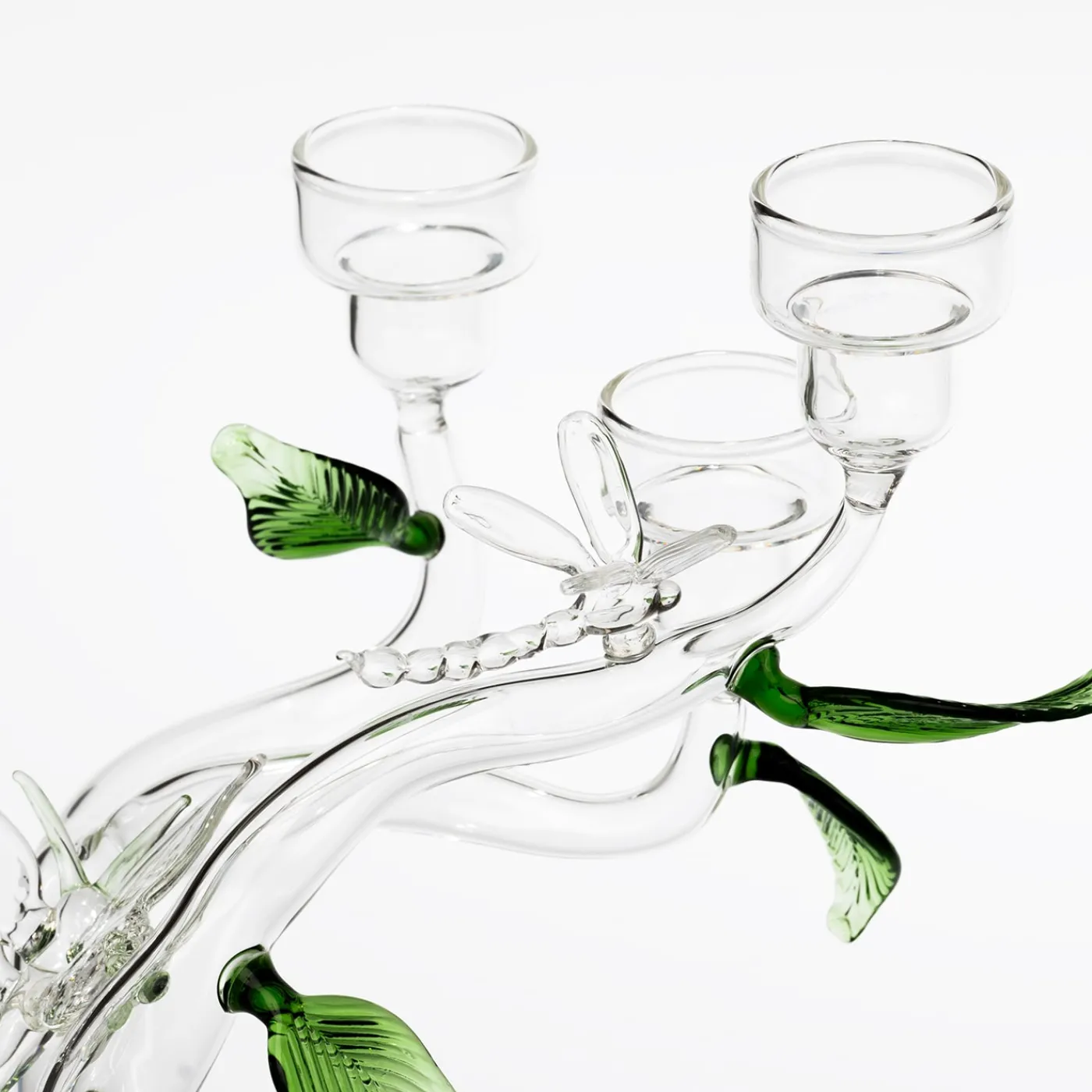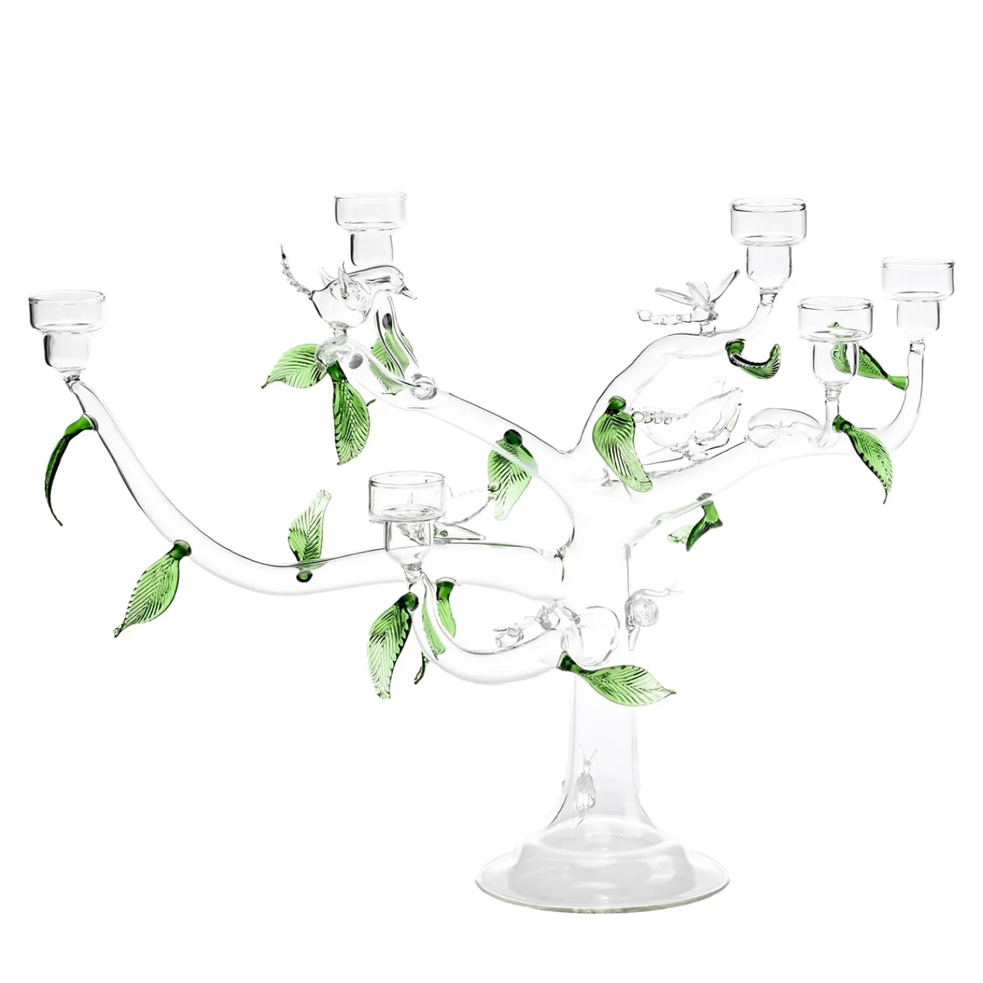 Questo portacandele in vetro artigianale, realizzato a Venezia, ricorda un albero trasparente ornato da foglie verdi e figure in vetro come farfalle, uccelli, libellule, lumache e coccinelle. Ispirato al giardino del Paradiso Terrestre, simboleggia i doni e le tentazioni della natura. Disegnato da Catherine Urban, il portacandele Eden può essere abbinato a candele lunghe o piccole, oppure a un mix di fiori. Ogni pezzo è unico, realizzato da artigiani veneziani.