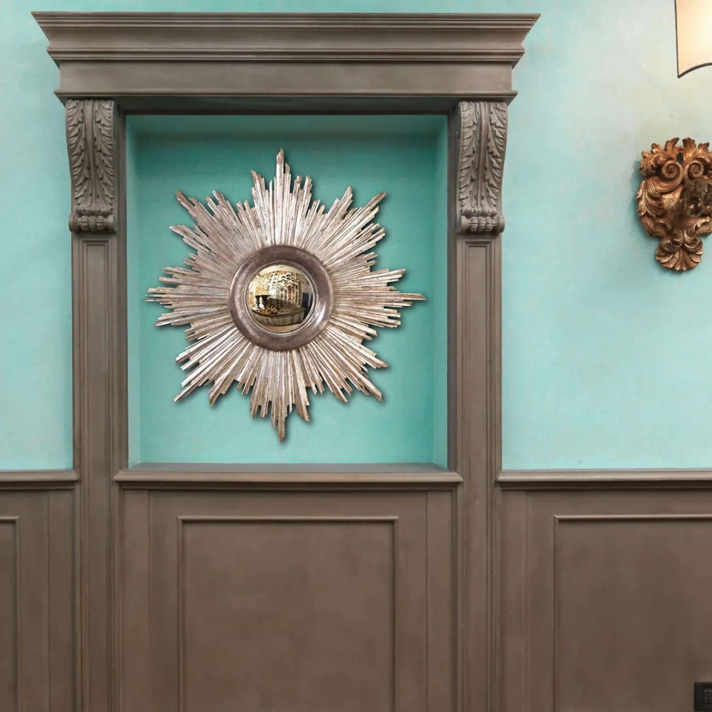 Questo specchio artigianale è una fedele riproduzione di un modello originale a raggiera. Interamente realizzato in legno intagliato a mano e decorato in foglia d’argento da Castorina a Firenze, il pezzo viene fornito con uno specchio convesso su misura.