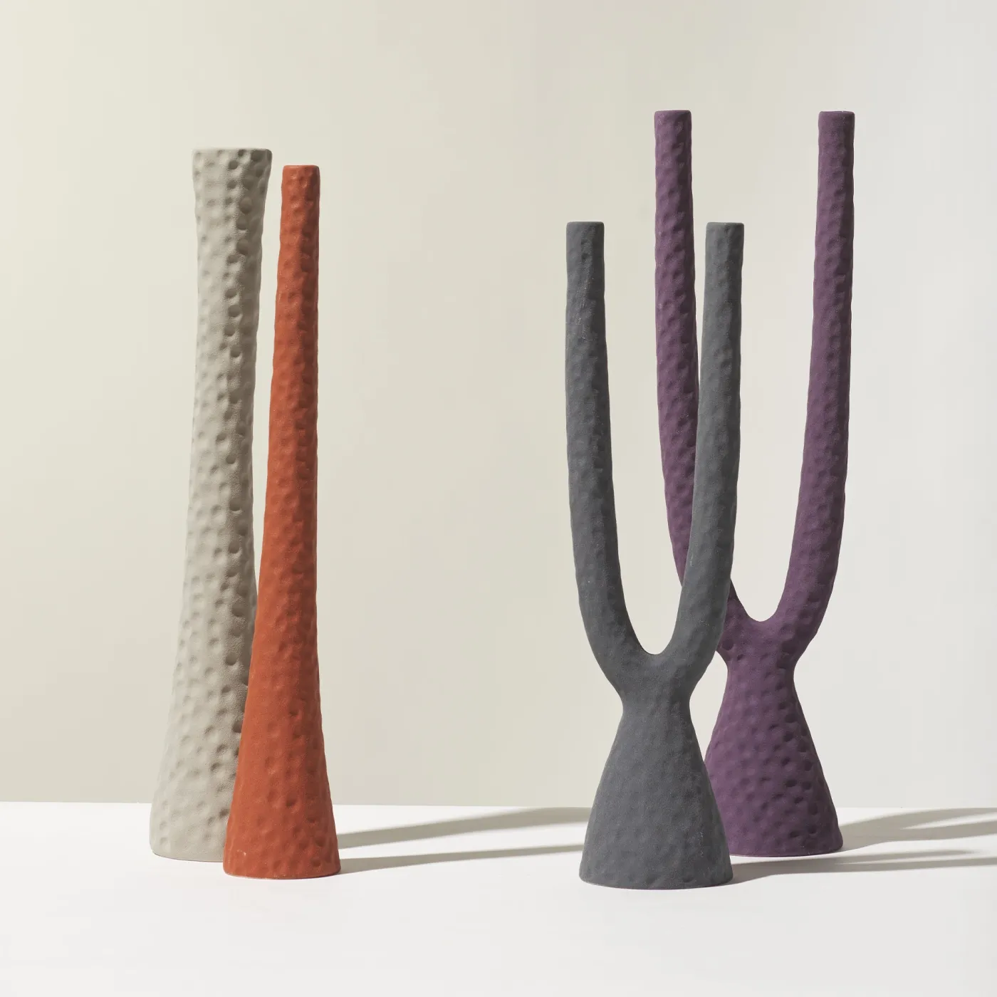 Ispirato ai design organici dei primi anni ’50 di Ceramica Gatti, questo candeliere unisce un’eleganza raffinata a forme allungate che richiamano le nature morte di Morandi. La superficie in terracotta, con la sua texture distintiva, è esaltata da una smaltatura opaca e polverosa applicata a spruzzo, che evoca la qualità tattile del rame invecchiato. Questo pezzo unico invita a creare composizioni coerenti e armoniose con vasi e ciotole abbinati, per un insieme decorativo di grande impatto.