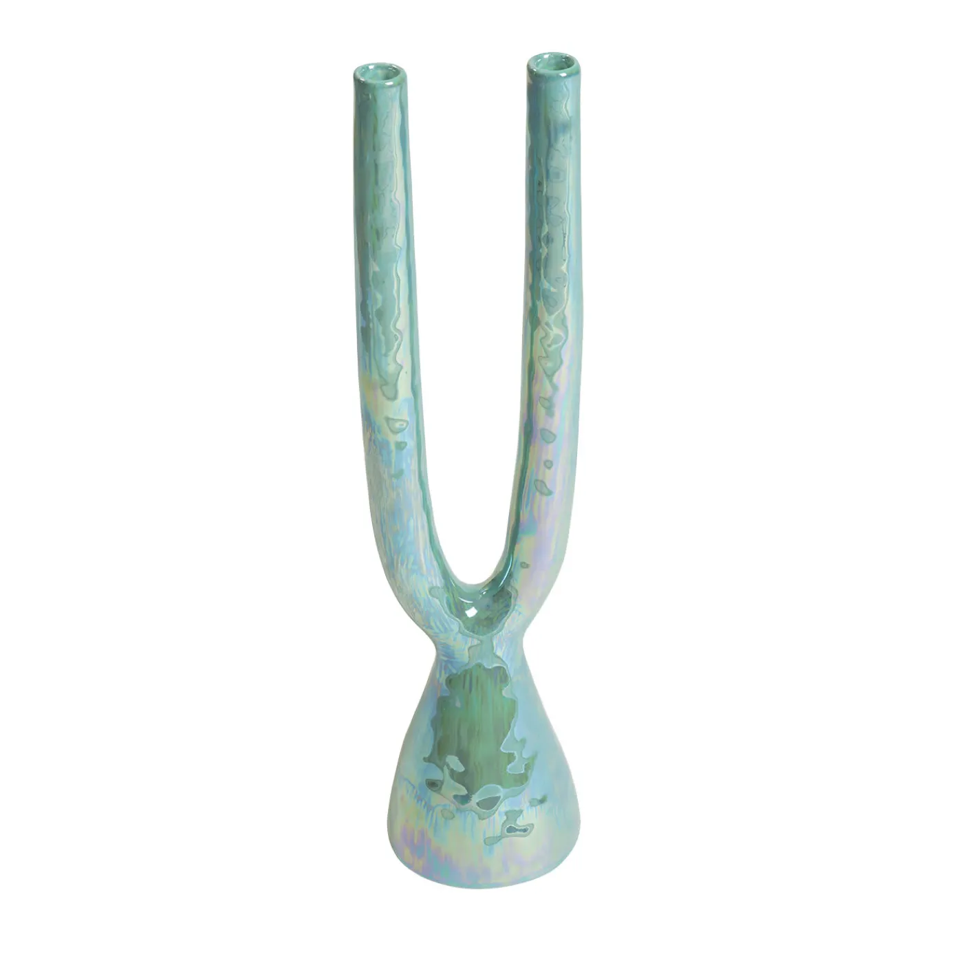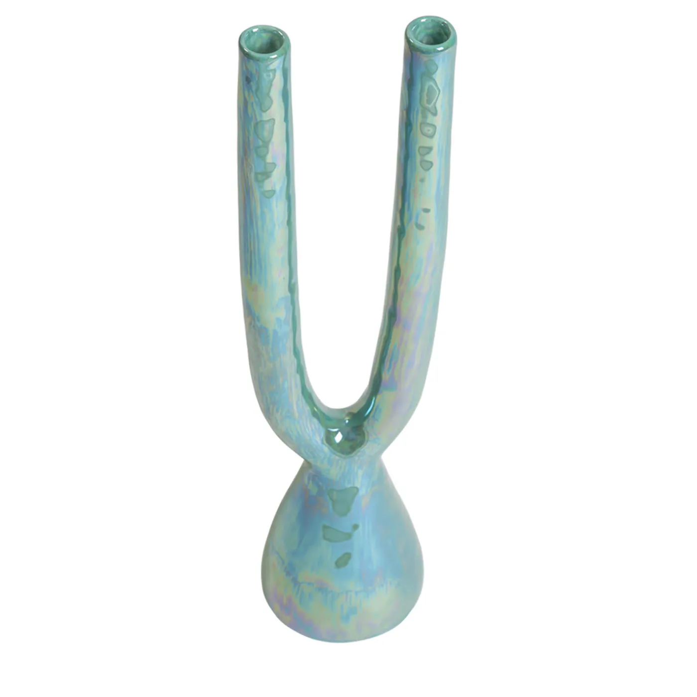 Questo doppio portacandele è un pezzo décor moderno e di classe di Gatti Ceramica. Dopo la prima cottura, l’originale in maiolica viene dipinto a mano in verde acqua e poi cotto per la seconda volta. Il pezzo è rifinito con un lustro di madreperla e una terza cottura, secondo le antiche tecniche di Faenza, capitale della ceramica del Nord Italia.
