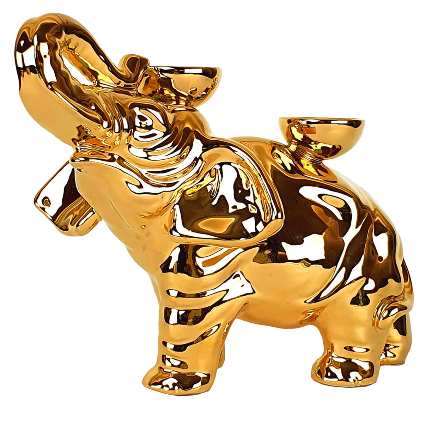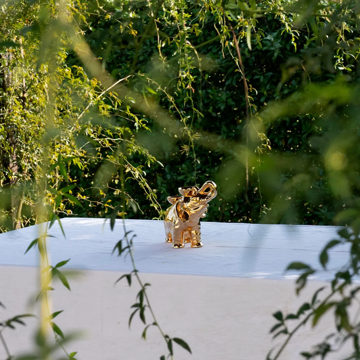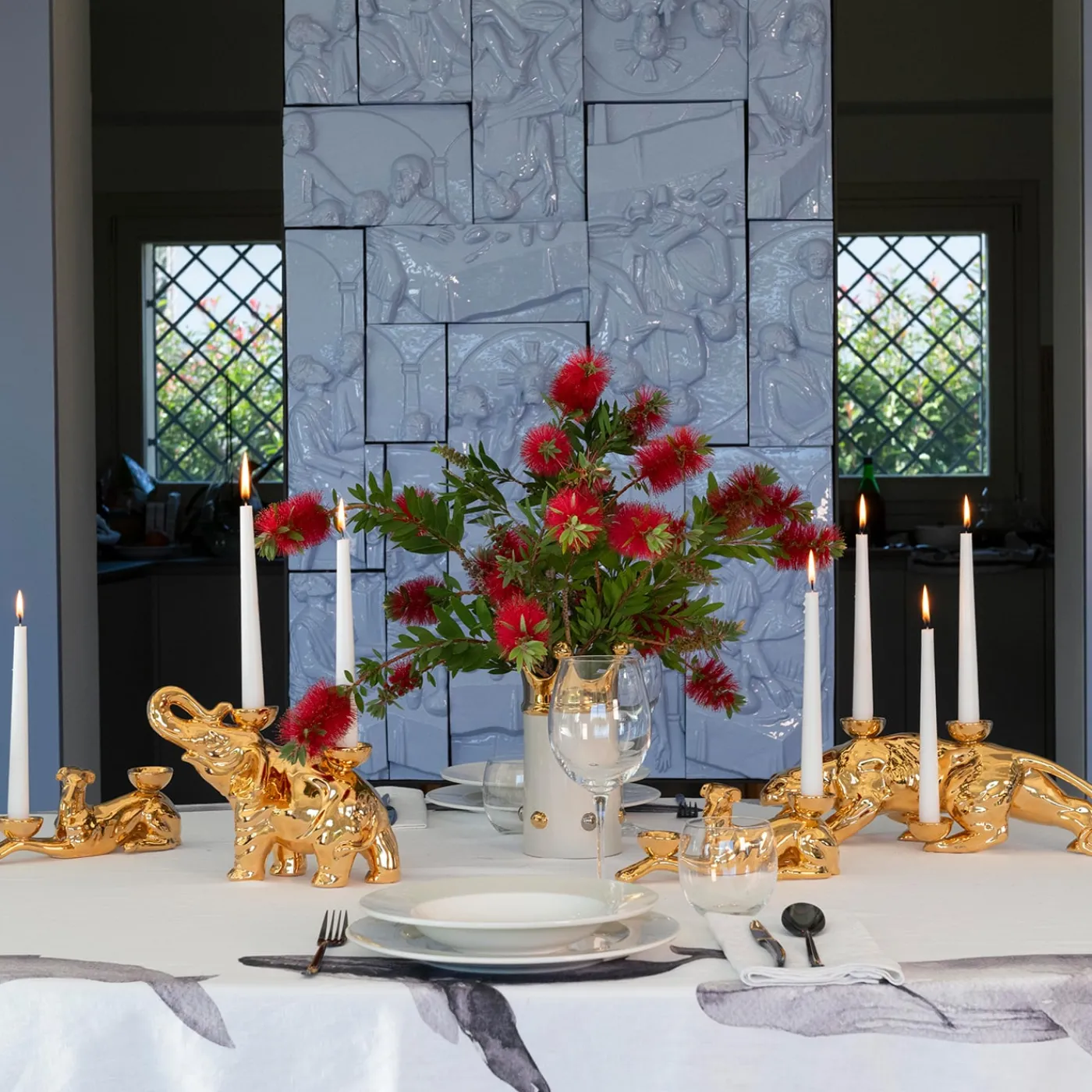 Lusso ed estrosità convivono senza sforzo in questo portacandele in maiolica a forma di elefante, la cui silhouette è ottenuta da argilla cotta originariamente versata in uno stampo. Abilmente dipinta a mano in una vivace tonalità dorata, la superficie acquista una finitura perfettamente liscia e lucida grazie al processo di doppia cottura. Un paio di bobeches incorporate completano il pezzo, disponibile in diverse varianti di animali e colori.