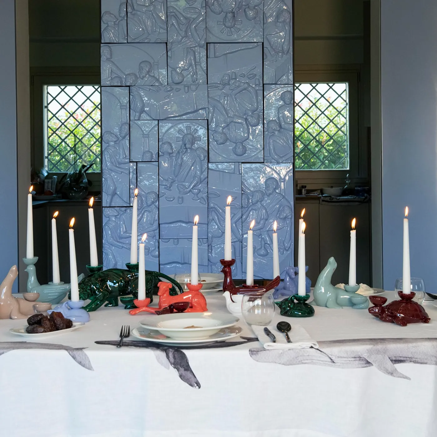 L’impatto glamour di una finitura in maiolica bordeaux superlucida incontra la giocosità di un corpo a forma di tartaruga in questo squisito portacandele zoomorfo. Ottenuto versando l’argilla liquida in uno stampo, viene successivamente smaltato e dipinto a mano e il suo aspetto viene sigillato da due diverse fasi di cottura. Nel catalogo Artemest sono disponibili anche versioni con diverse forme di animali e varianti di finitura.