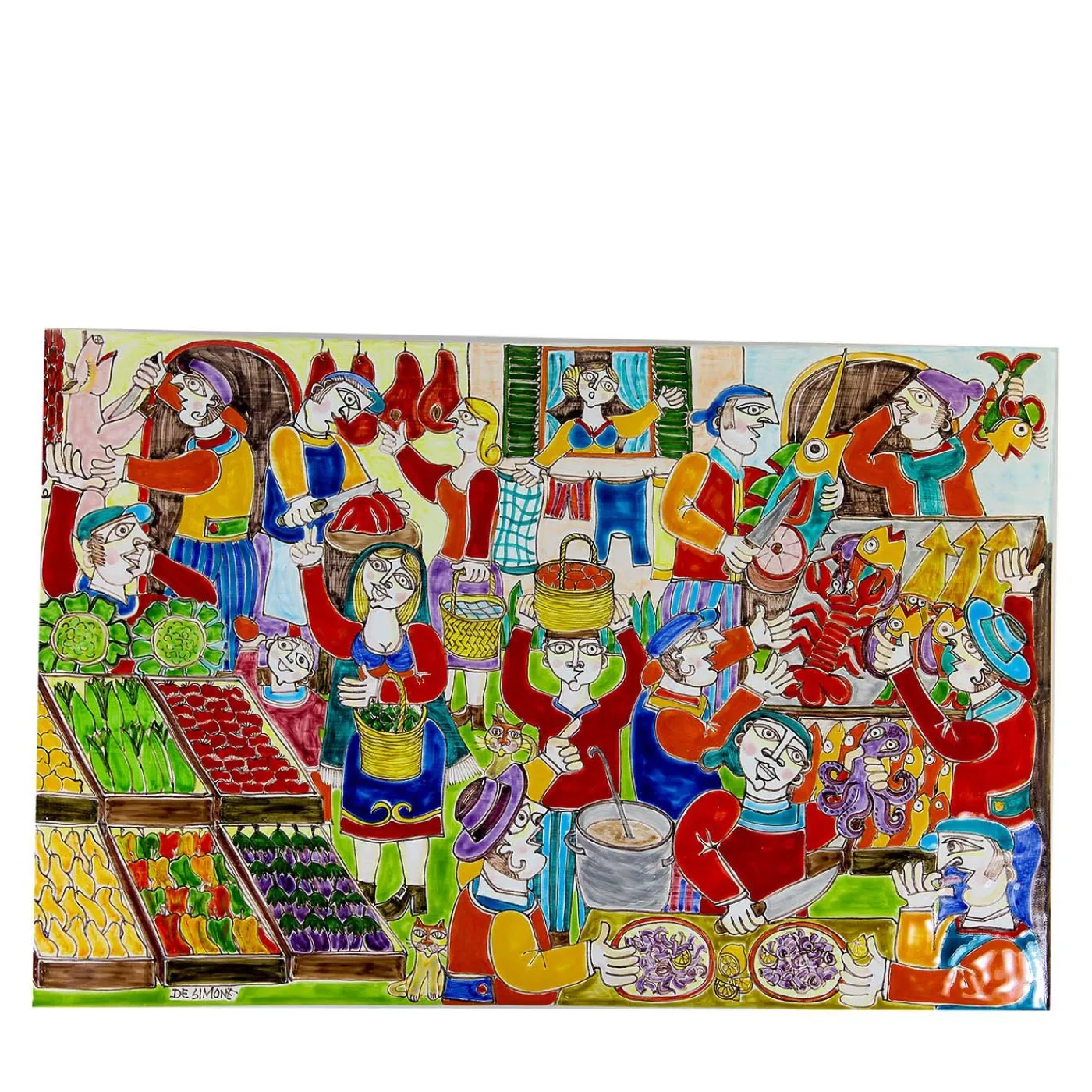 Raffigurante un’affascinante e vivace scena di mercato, questo pannello in ceramica di alta qualità è stato realizzato e magnificamente dipinto a mano da esperti artigiani per illuminare qualsiasi ambiente. Con una dimensione di 40 x 60 cm, questo complemento d’arredo originale e artistico aggiungerà un tocco di freschezza a qualsiasi arredamento contemporaneo con i suoi colori vivaci e la sua vivace illustrazione.
