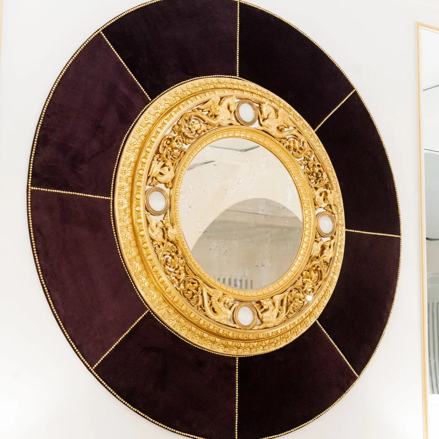 Sublime esempio di artigianato tradizionale, questo splendido specchio è finemente intagliato a mano con un classico motivo ornamentale che racchiude uno specchio centrale in finitura foglia oro, decorazioni in selenite e completato da un antico specchio antico Vienna. La parte esterna è rivestita in velluito e ha dettagli in bronzo placcato oro 24 carati.