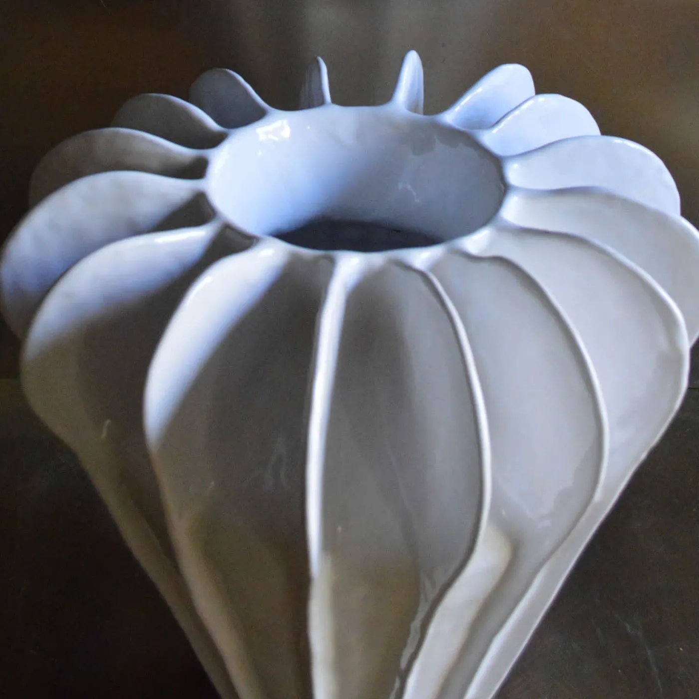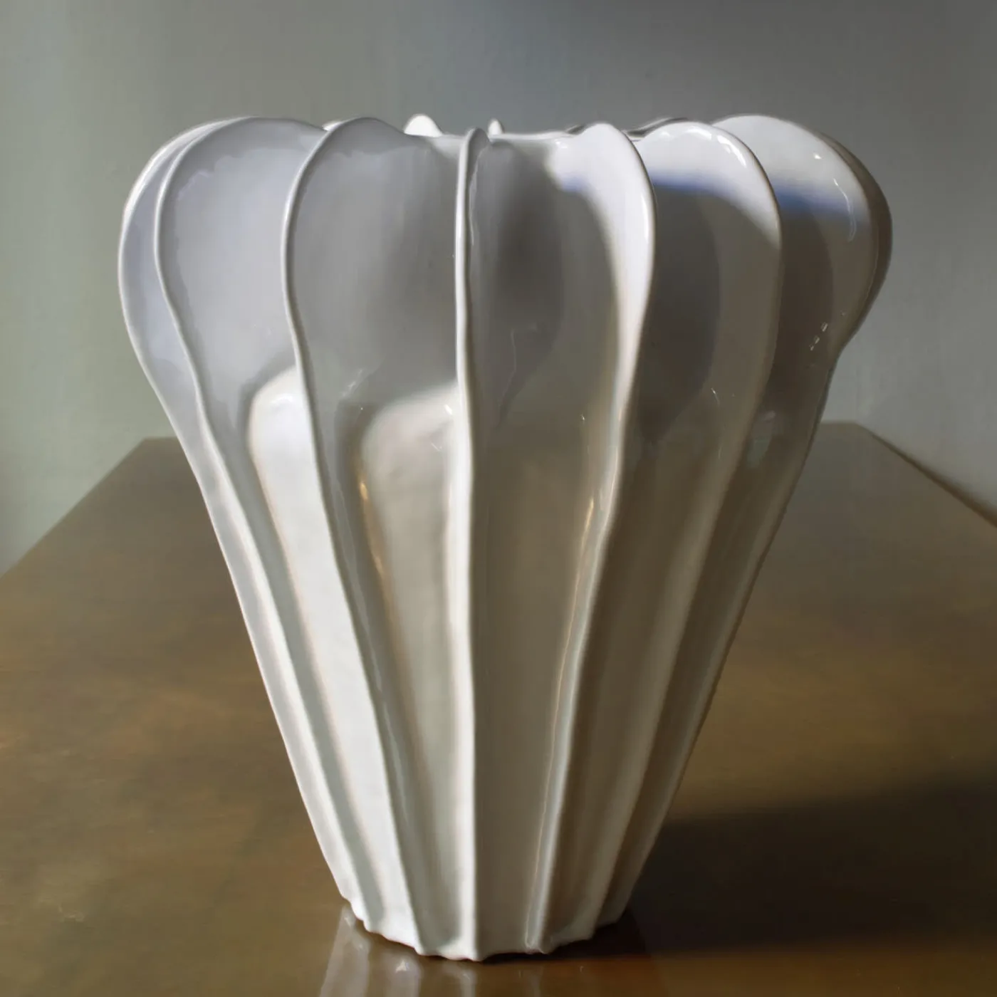Curve drammatiche e una silhouette sinuosa definiscono questo vaso in terracotta smaltata in bicottura. Gli audaci pannelli curvi tracciano i contorni fluidi del corpo del vaso, rivelando una forma a fisarmonica interamente realizzata a mano con l’antica tecnica del “colombino”. Lievi variazioni di forma, dimensione e colore sono da aspettarsi e sono considerate un segno di esclusività.