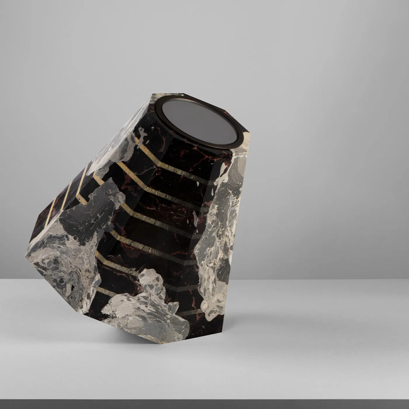 Prisma ottagonale in Scagliola intarsiata realizzato interamente a mano secondo la tradizione carpigiana. Lavorato con colla e pigmenti naturali, il gesso viene modellato per imitare i tratti del marmo. Lo specchio è incastonato in una cornice di ottone in accordo con i toni dell’impasto. Questo specchio da tavolo è dedicato ad Alfonso Bialetti, creatore della famosa Moka; la forma ottagonale del prisma riprende il manico in bachelite della caffettiera. Pezzo unico