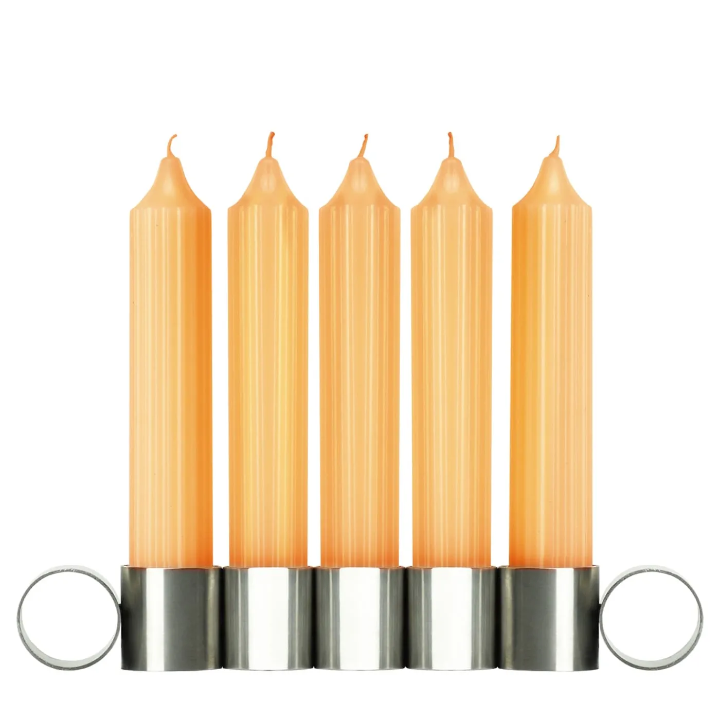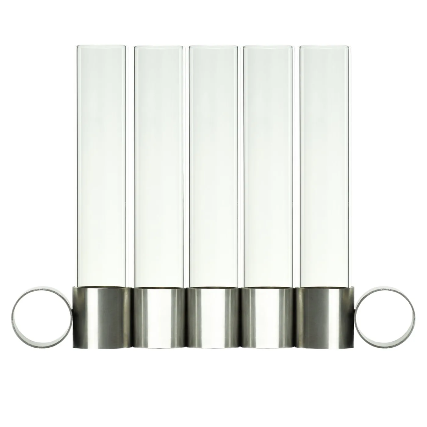 Portacandele e portafiori in un unico oggetto, Tempio del Tempo è stato concepito come un piccolo altare per la casa, creato attraverso l’unione di forme semplici e simboliche che si incastrano senza connessioni e rimangono divisibili: due anelli in acciaio inox uniti tra loro con una saldatura invisibile, una candela in pura cera di soia con stoppino in cotone e un vaso in vetro borosilicato. La chiusura rimovibile della base in acciaio è realizzata in gomma riciclata e crea il supporto ideale per accogliere le candele. Candele e vasi di vetro inclusi.