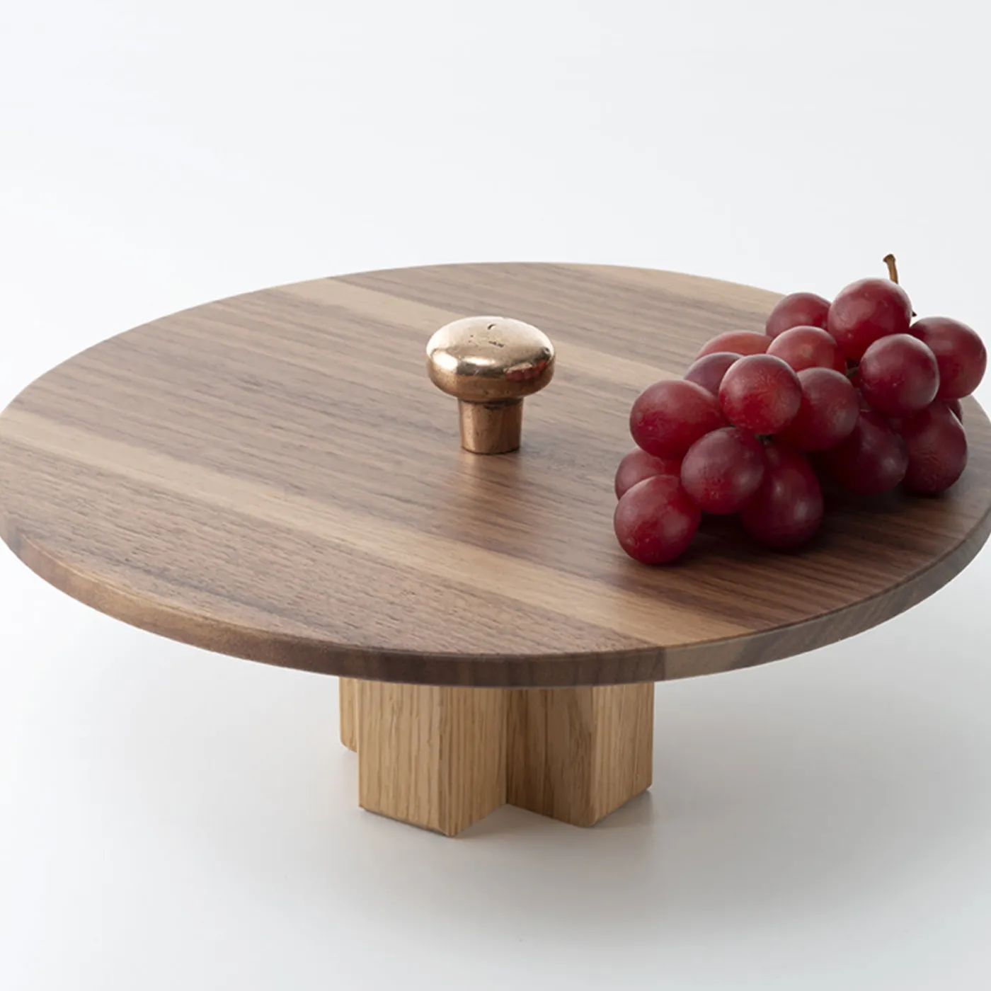Questo raffinato centrotavola fa parte della collezione che celebra le sculture dell’artista Constantin Brancusi. Montato su una base a croce in legno di quercia spazzolato, il vassoio circolare in noce canaletto è dotato di un delicato manico a forma di goccia in bronzo fuso. Le particolari venature dei legni contribuiscono al fascino visivo e tattile di questo centrotavola, che si presenta in una raffinata confezione regalo grigia con il logo Colè in argento.