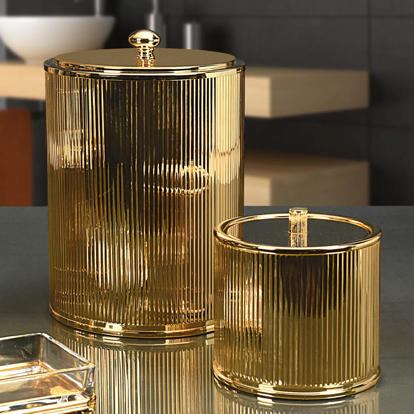 Splendida vetrina di artigianato, questo magnifico set da bagno è composto da un piccolo cestino e da una scatola interamente realizzati a mano in ottone con preziose finiture in oro galvanizzato 24k. Ricchi di un fascino sontuoso, entrambi i pezzi sono decorati con un motivo a scanalature verticali e completati da un raffinato e pratico coperchio.