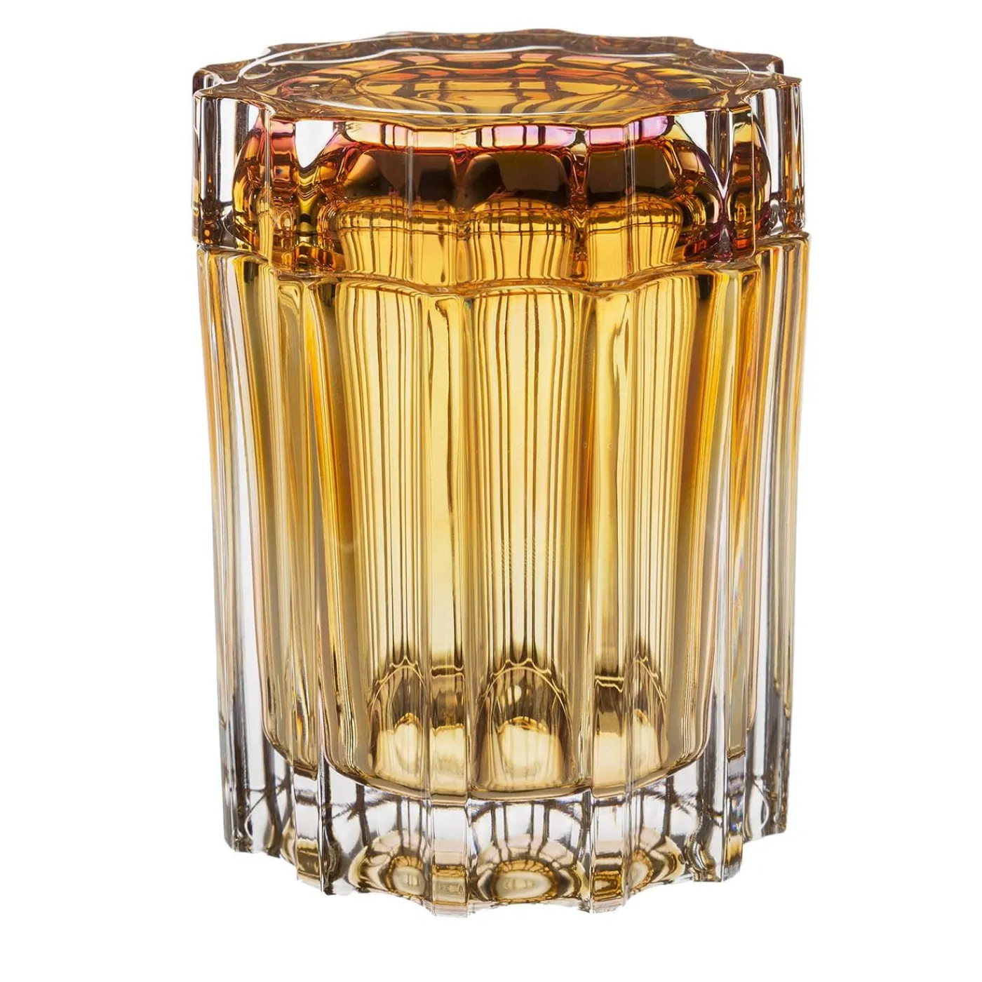 Squisitamente realizzato a mano in vetro trasparente con una delicata tonalità ambrata, questo set di due scatole sarà un’aggiunta unica al tavolino da toilette di una camera da letto o di una toilette. Ognuno dei due pezzi è magistralmente decorato a mano e presenta delle suggestive pieghe verticali che creano un gioco di luci e ombre sulla superficie del vetro.