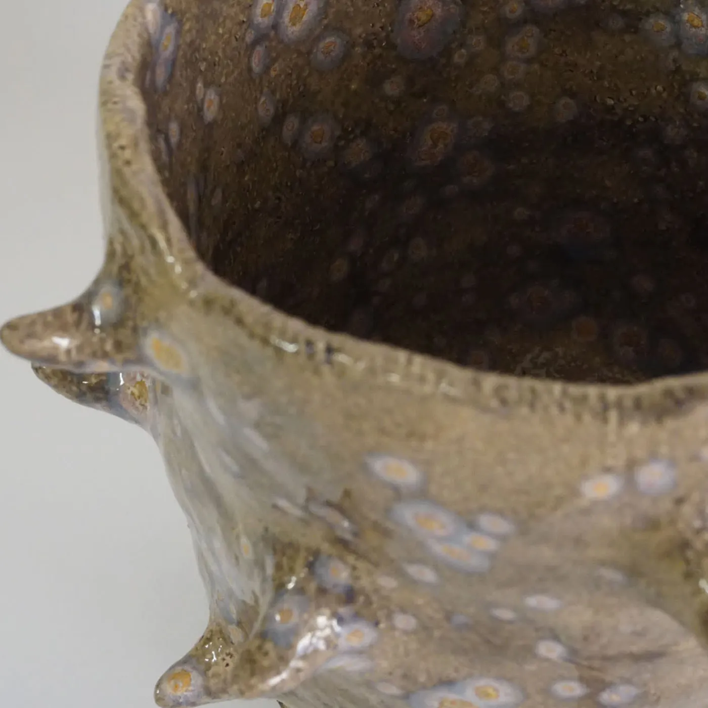 Con un design volutamente irregolare, caratterizzato da protuberanze appuntite che ricreano quasi delle fiamme cristallizzate, questo vaso appartiene alla collezione Lava. Diversi dettagli incisi aggiungono ulteriore dinamismo alla texture generale, mentre un vivace motivo screziato grigio e oro si staglia sulla superficie smaltata in tonalità verde. Un’ode alle forme naturali, ogni vaso è fatto a mano e unico.
