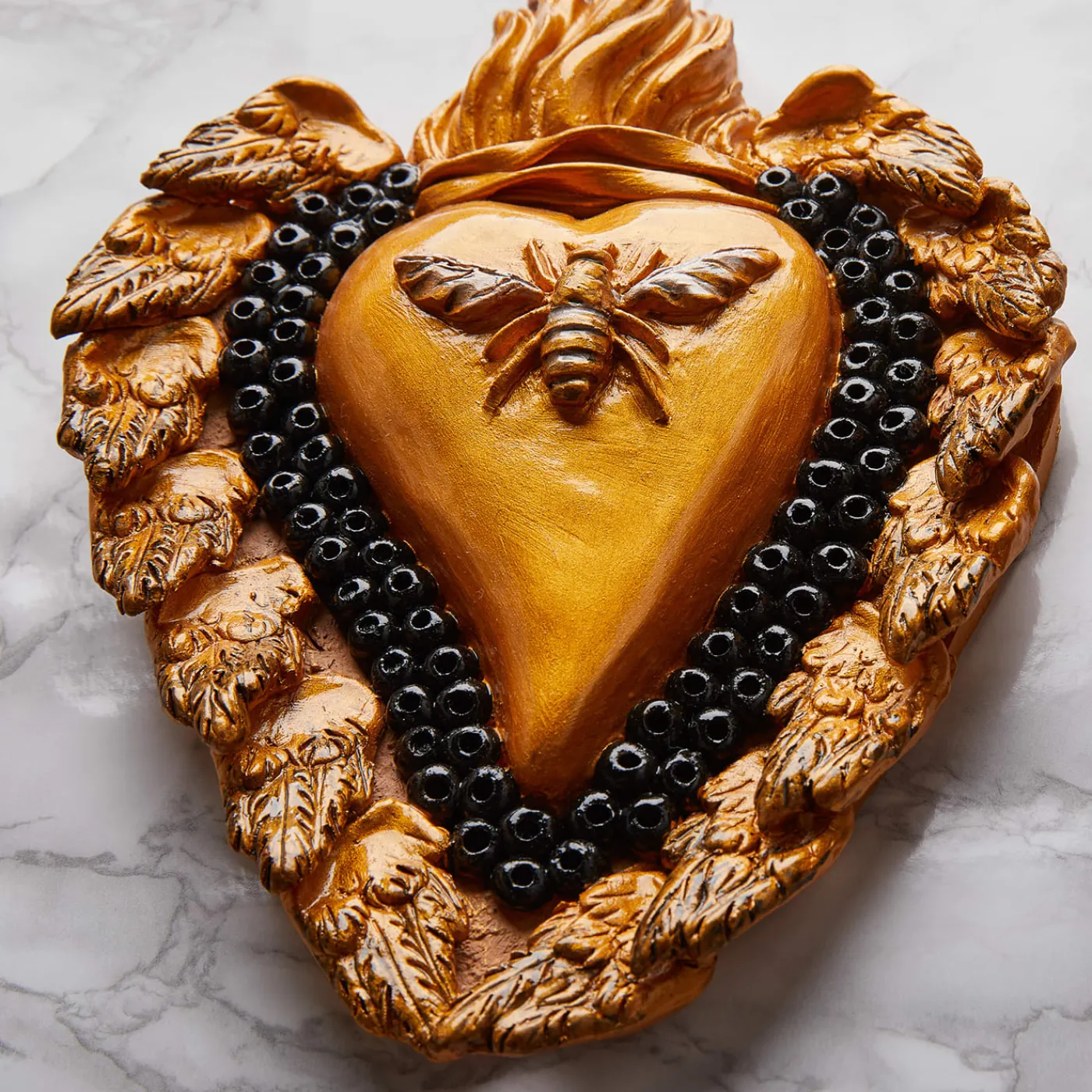 Questo splendido cuore in ceramica d’oro lavorato e dipinto a mano, con un’ape d’oro centrale e squisitamente dettagliata, è un simbolo straordinario di prosperità e fecondità della natura. Ispirato ai cuori ex-voto devozionali presenti in molte chiese italiane, questo oggetto d’arte unico sarà un affascinante regalo di benvenuto.