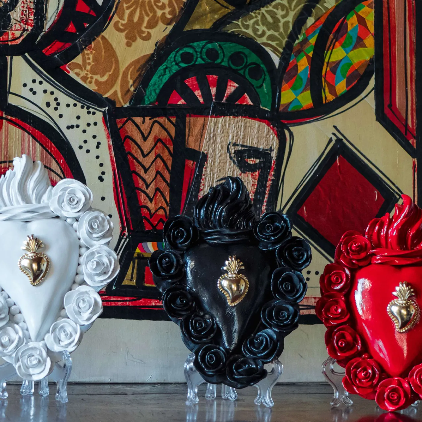 Una rivisitazione contemporanea del tradizionale cuore devozionale ex-voto, questo raffinato oggetto d’arte è interamente realizzato e dipinto a mano. Presenta un cuore in ceramica smaltata nera con un piccolo cuore interno in metallo e una cornice squisitamente dettagliata di raffinate rose nere. Un pezzo straordinario, da abbinare ad altri elementi della stessa serie.