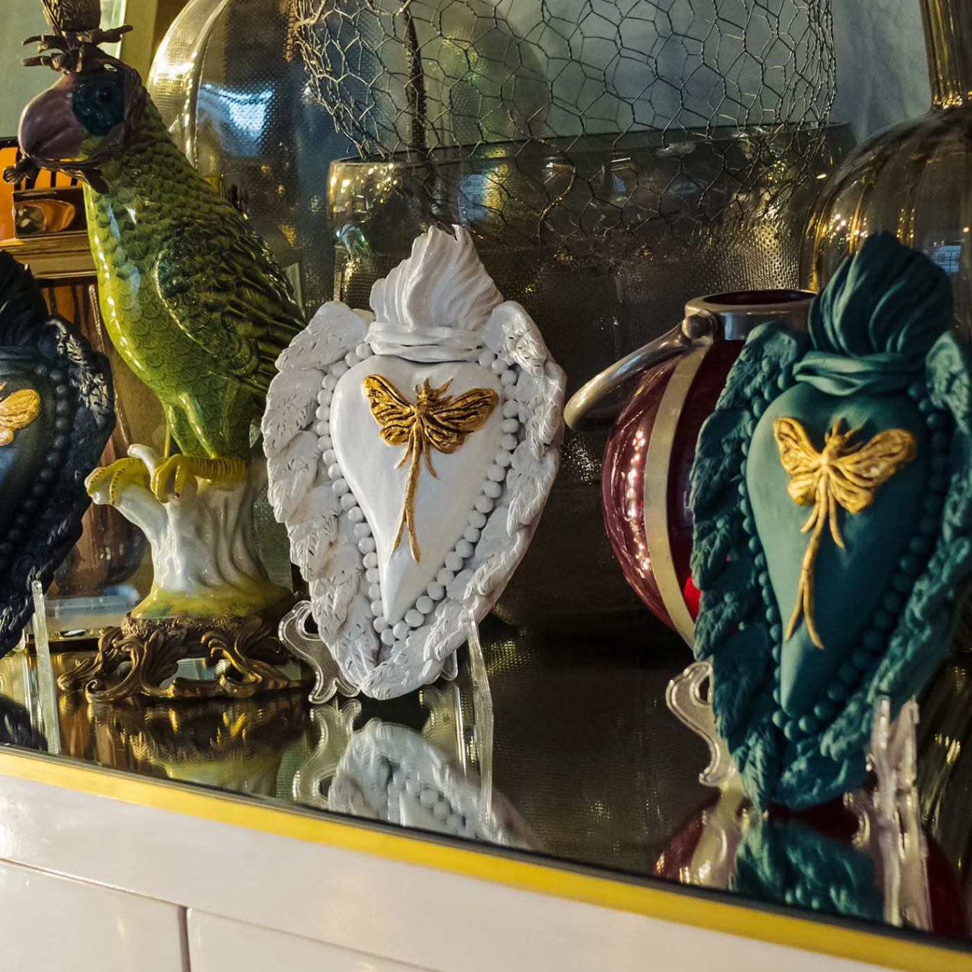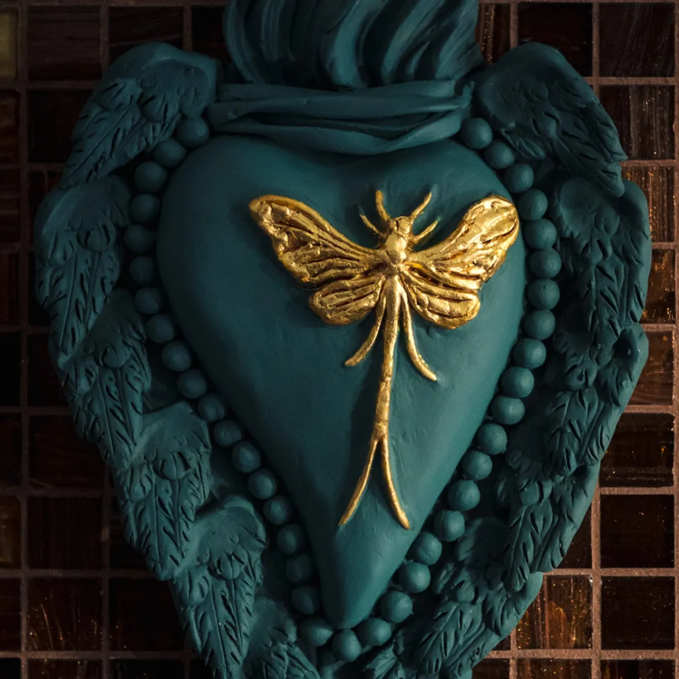 Splendido e poetico omaggio all’amore e alla primavera, questo magnifico cuore in ceramica è un’abile dimostrazione di maestria artigianale. Arricchito da dettagli preziosi, presenta al centro una Mayfly in foglia d’oro. Interamente laccato in un colore verde smeraldo opaco, è incorniciato da un filo di perle e da piumose ali d’angelo.