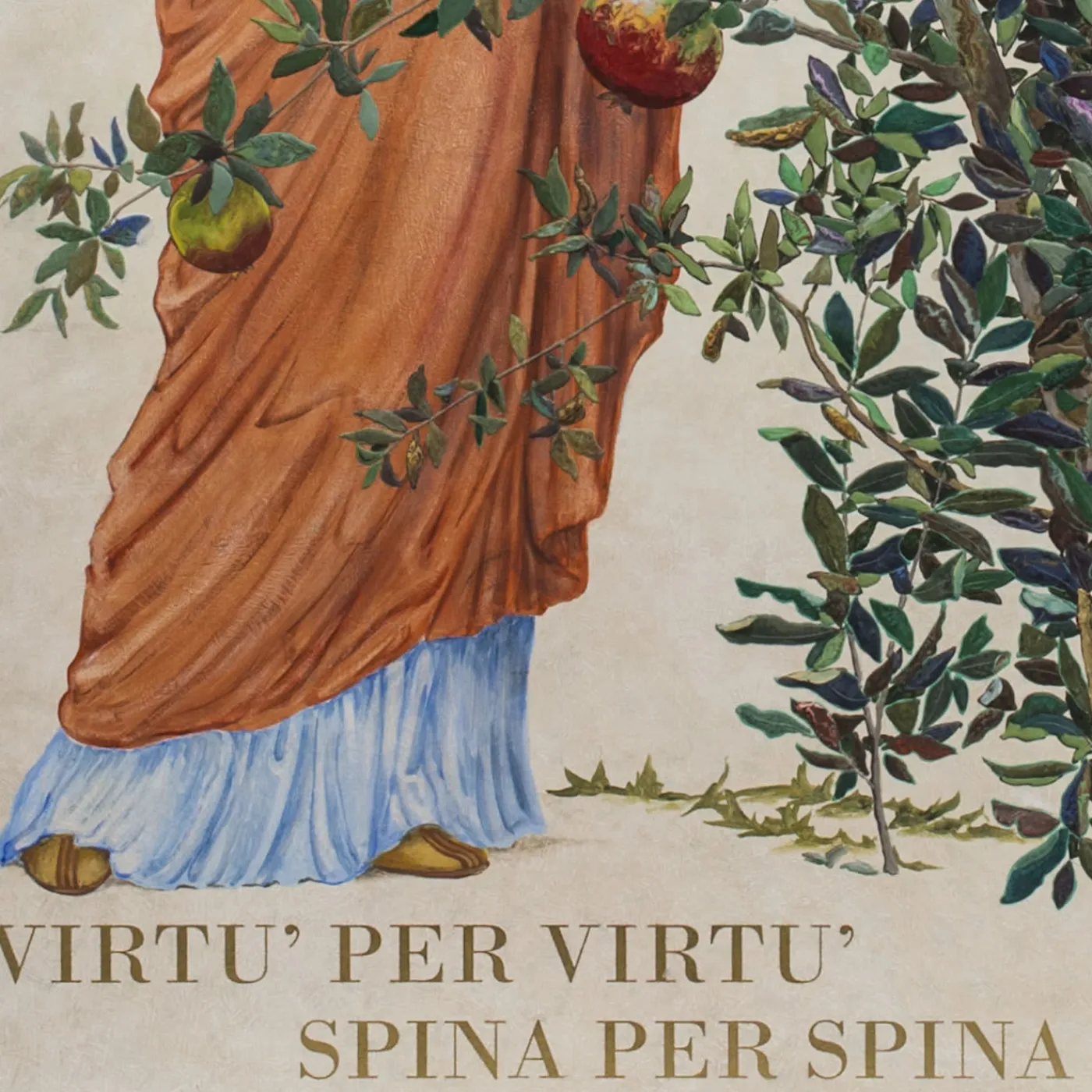 Questo pannello artistico raffigura Livia, moglie degli imperatori romani Nerone e Augusto, accanto a un albero di melograno con l’iscrizione in italiano Virtù per virtù, spina per spina. Le iscrizioni si riferiscono al carattere virtuoso, ma problematico, di Livia, poiché gli uomini che ostacolavano l’ascesa al potere di Augusto spesso morivano misteriosamente. Dipinto per commemorare il 2.000° anniversario della morte di Augusto.