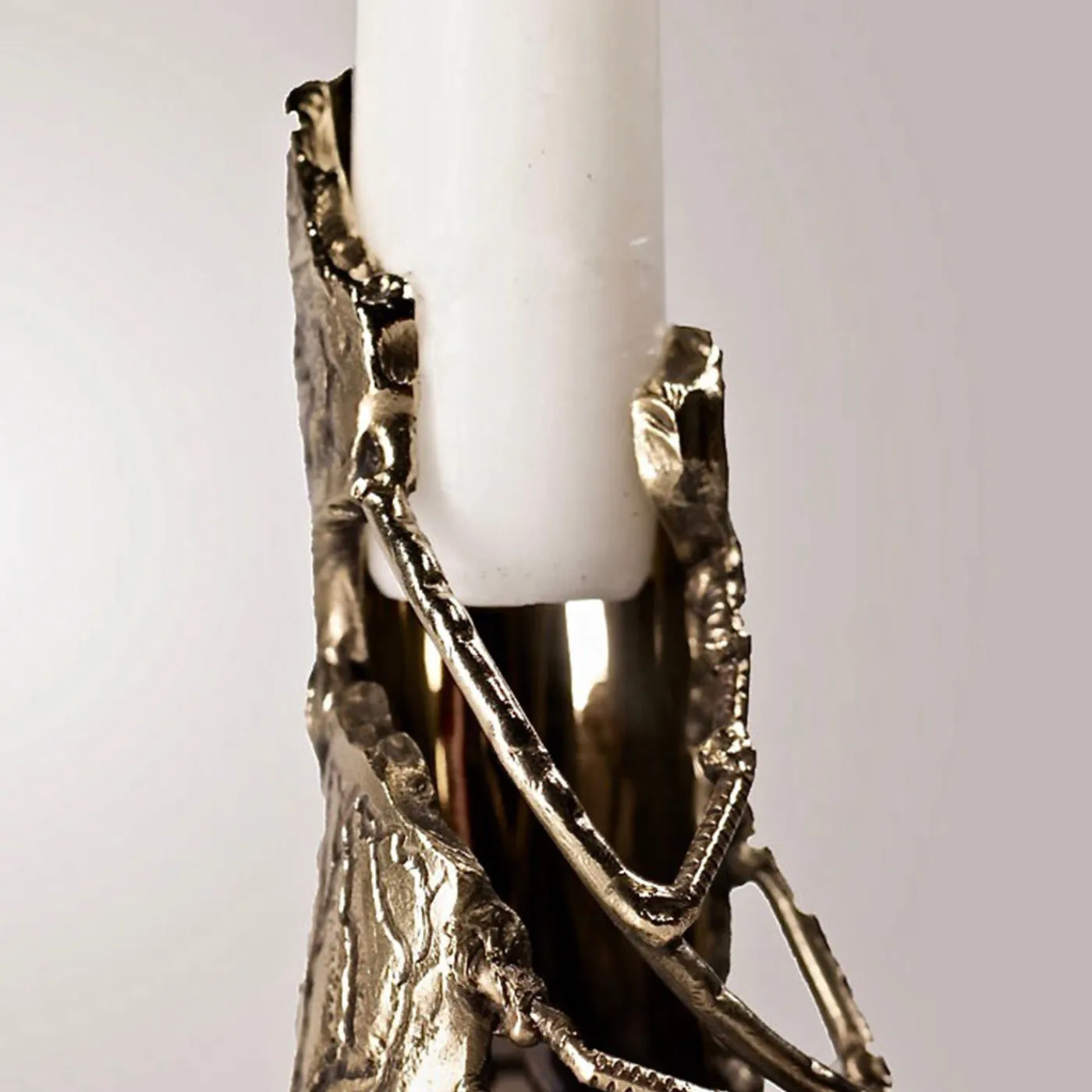 La natura cambia forma e si spoglia, lasciando tracce di questo cambiamento sul terreno. Il candeliere Underwood è realizzato in ottone fiammato e battuto a mano, progettato per assomigliare a pezzi di corteccia caduti da un albero. Rifinito con patina di bronzo e lucidato. Ogni pezzo è realizzato a mano in Italia, firmato e numerato.