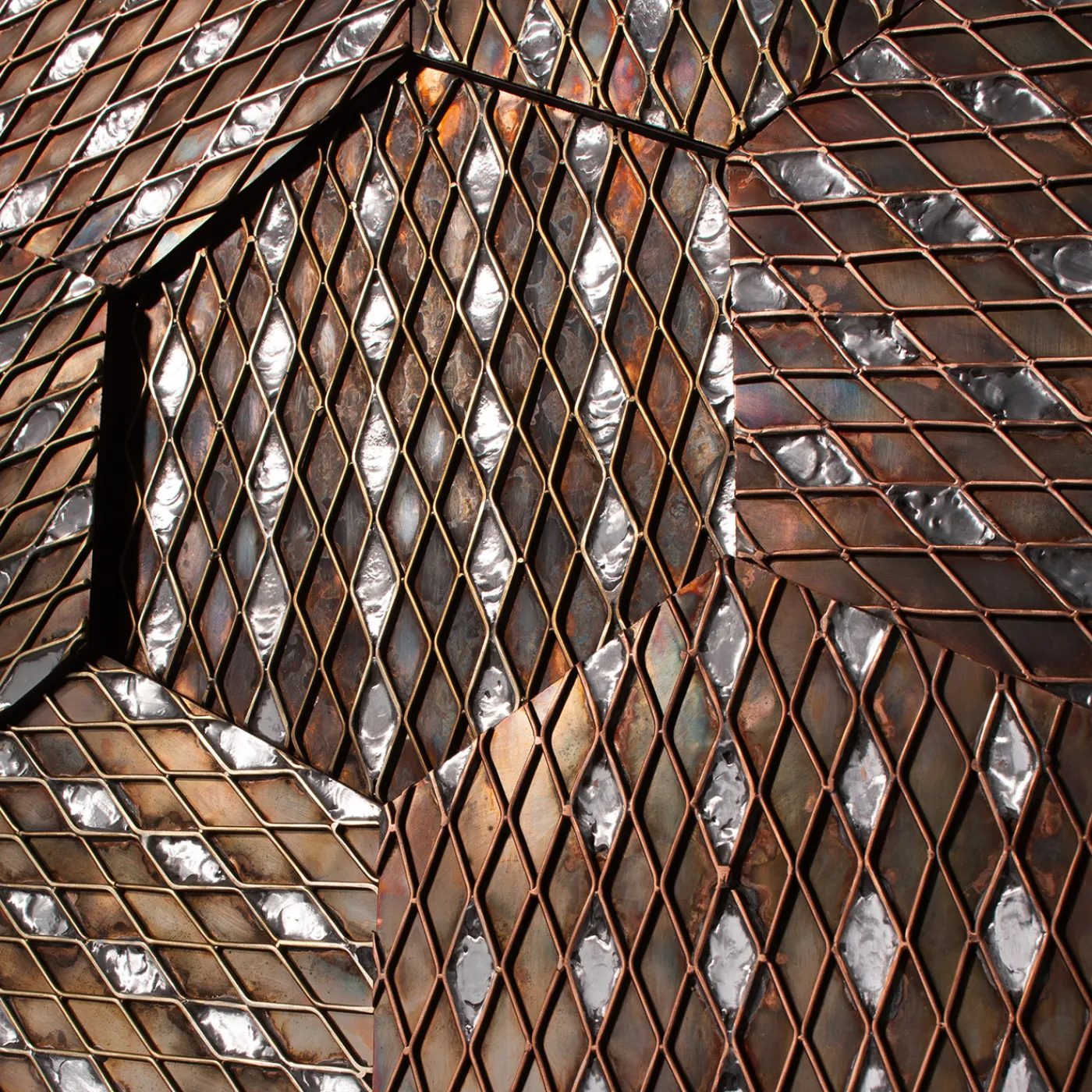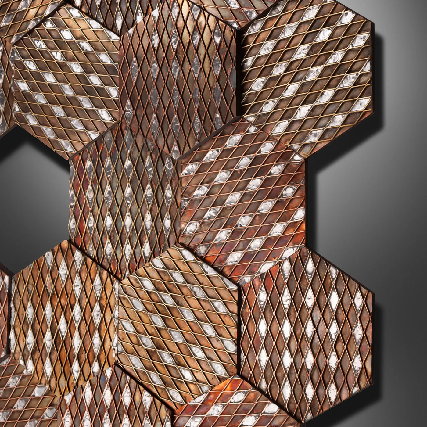 Il pannello decorativo Filigrana combina eleganza e maestria artigianale, con una composizione di elementi esagonali in rame finitura Debatè sovrapposti a una griglia a diamante. I dettagli a forma di diamante sono valorizzati da contrasti di stagnatura alternata e da una finitura ottenuta tramite ripetuta fiammeggiatura, che conferisce profondità e tridimensionalità. La luce e la texture interagiscono armoniosamente, evocando l’incontro tra motivi ispirati ai tessuti e la forza espressiva del metallo.