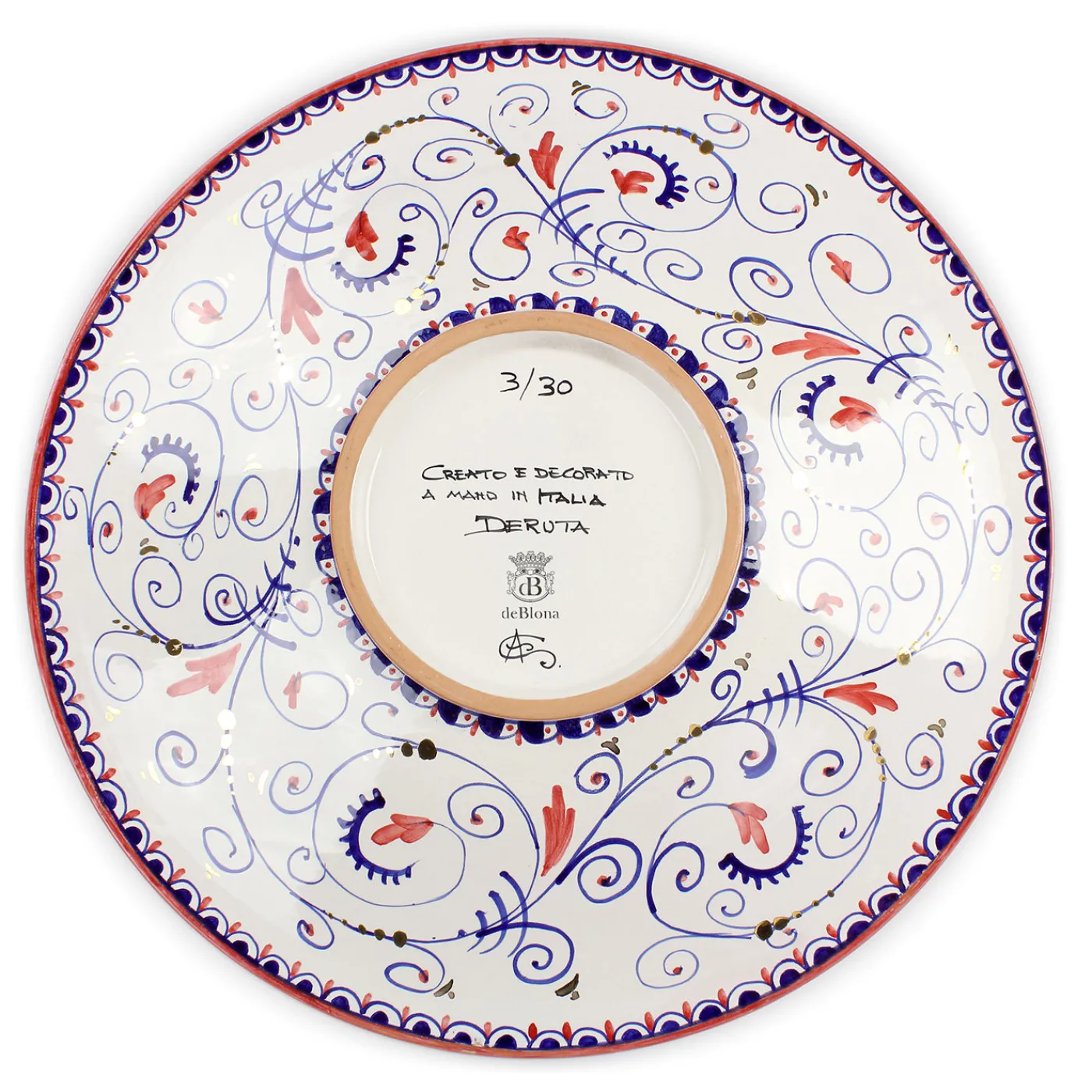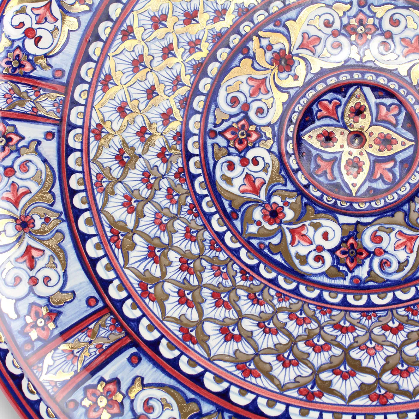 Il piatto Moorish Gold è realizzato in maiolica e decorato a mano in una sorprendente combinazione di blu e rosso intenso. Il design ricco di dettagli trae ispirazione dall’arte moresca, con motivi vegetali a spirale e forme a cuore lungo il bordo esterno, mentre la fascia interna presenta eleganti decorazioni floreali incorniciate da un motivo radiale a embricazioni. Accenti in lustro d’oro applicati con tecnica di terza cottura valorizzano la composizione, culminando in una figura fitomorfa adornata da foglie dorate e fiori rossi che si estende lungo la circonferenza. Ogni pezzo, prodotto in edizione limitata, è certificato e firmato sul retro, e può presentare leggere variazioni che ne attestano l’autenticità artigianale.