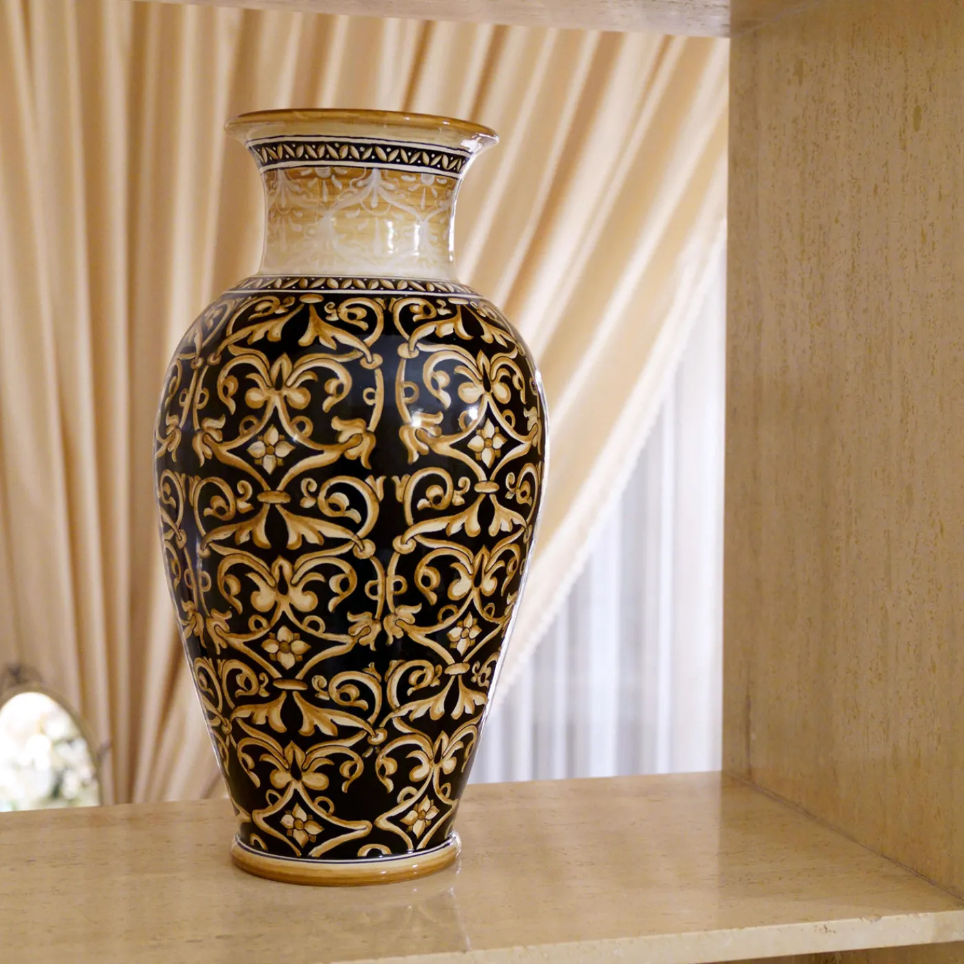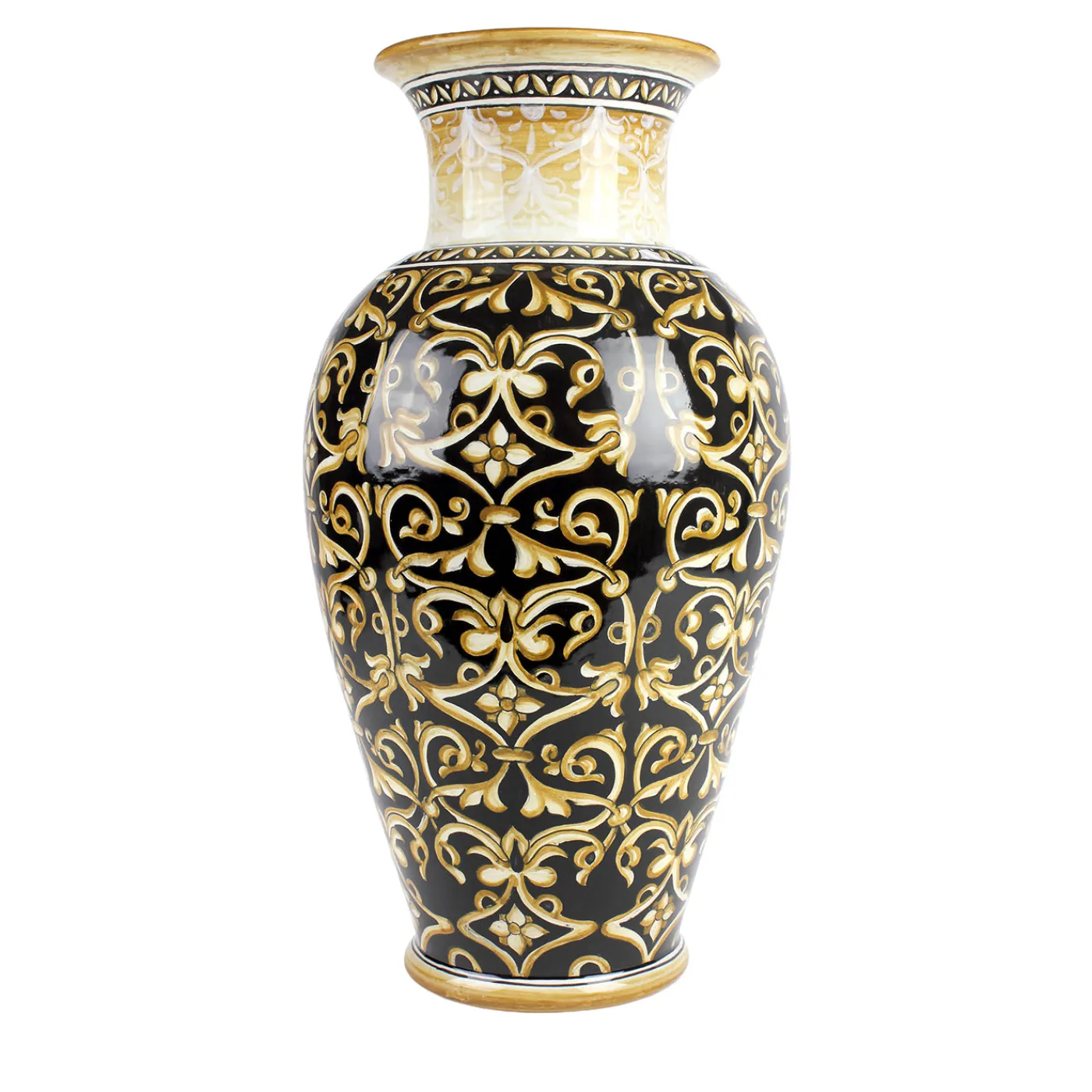 Questo vaso slanciato presenta un collo elegantemente svasato con bordo rovesciato su uno sfondo nero intenso. La superficie è decorata con motivi naturalistici intricati ispirati alla tradizione di Deruta, disposti in schemi simmetrici. Racemi delicati e gigli in giallo oro vivace fioriscono armoniosamente, mentre il collo è arricchito da moduli di morbidi motivi giallo oro sfumati con bianco cerio. Sottili dettagli dorati evidenziano il bordo e la base, conferendo al vaso un’eleganza raffinata e sofisticata. Ogni pezzo presenta leggere variazioni che ne testimoniano la natura artigianale.