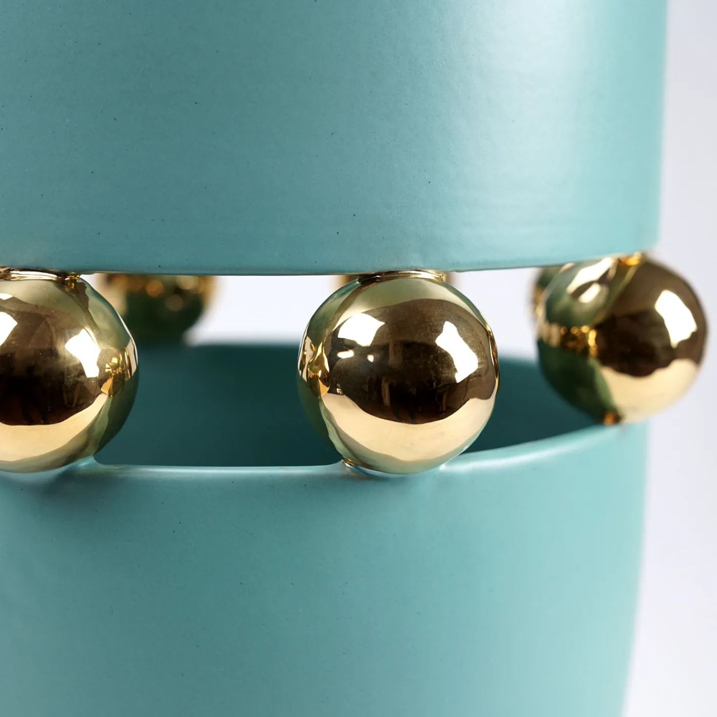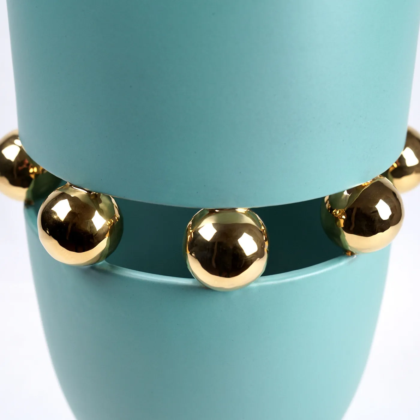 Il vaso Kósmos Aquamarine si distingue per la sua elegante finitura opaca, impreziosita da dettagli in oro 24kt applicati tramite un esclusivo processo di cottura in tre fasi che ne esalta la brillantezza. Il design unisce linee essenziali a una lavorazione complessa, realizzato interamente in un unico pezzo senza l’uso di colle o giunture. Un marchio impresso ne certifica l’autenticità, espressione di un’artigianalità raffinata pensata per contesti decorativi sofisticati. Trattandosi di un prodotto artigianale, ogni pezzo è unico e può presentare leggere variazioni rispetto all’immagine.