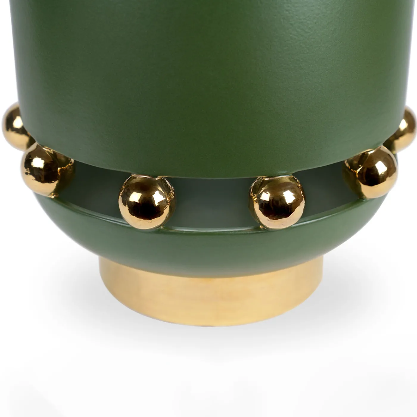 Questo vaso decorativo distintivo presenta una raffinata finitura verde opaca, arricchita da dettagli lucidi in oro 24 carati. Il design integra eleganti sfere dorate che dividono le sezioni superiore e inferiore del vaso, creando un suggestivo contrasto tra superfici opache e brillanti. Realizzato tramite un complesso processo di cottura in tre fasi, il vaso è prodotto in un unico pezzo senza parti assemblate, esaltando l’abilità artigianale e una linea estetica essenziale. Ogni esemplare è interamente fatto a mano, pertanto possono esserci lievi variazioni rispetto all’immagine, a testimonianza della sua unicità artigianale.