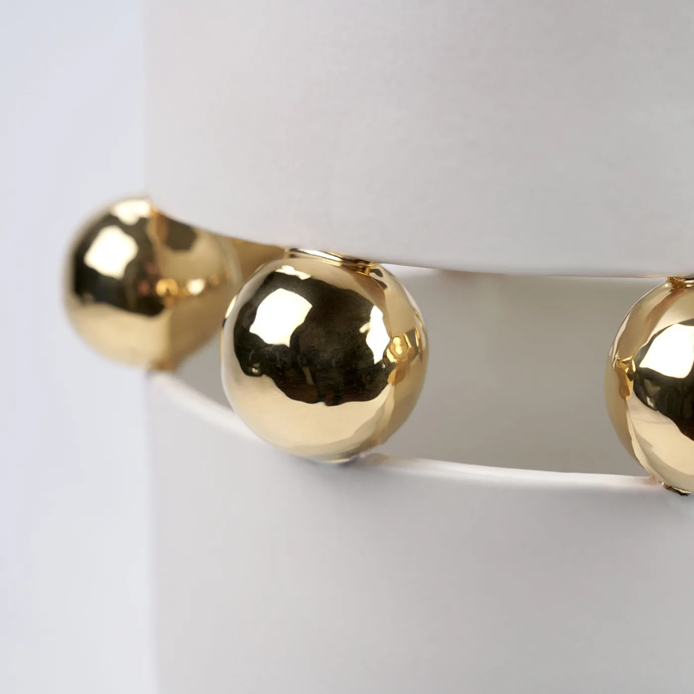 Il vaso Kósmos si distingue per la sua elegante finitura bianca opaca, impreziosita da un anello centrale di sfere riflettenti rivestite in oro 24 kt. Questo dettaglio dorato crea un raffinato contrasto visivo, esaltando il dialogo tra minimalismo e complessa maestria ceramica. Ogni pezzo è sottoposto a un articolato processo di lavorazione con tre cotture, culminando nella terza fase che fissa la brillantezza dell’oro e ne amplifica la luminosità. L’intera produzione è realizzata a mano, rendendo ogni vaso unico con lievi variazioni che testimoniano l’autenticità del lavoro artigianale. Colore personalizzabile.