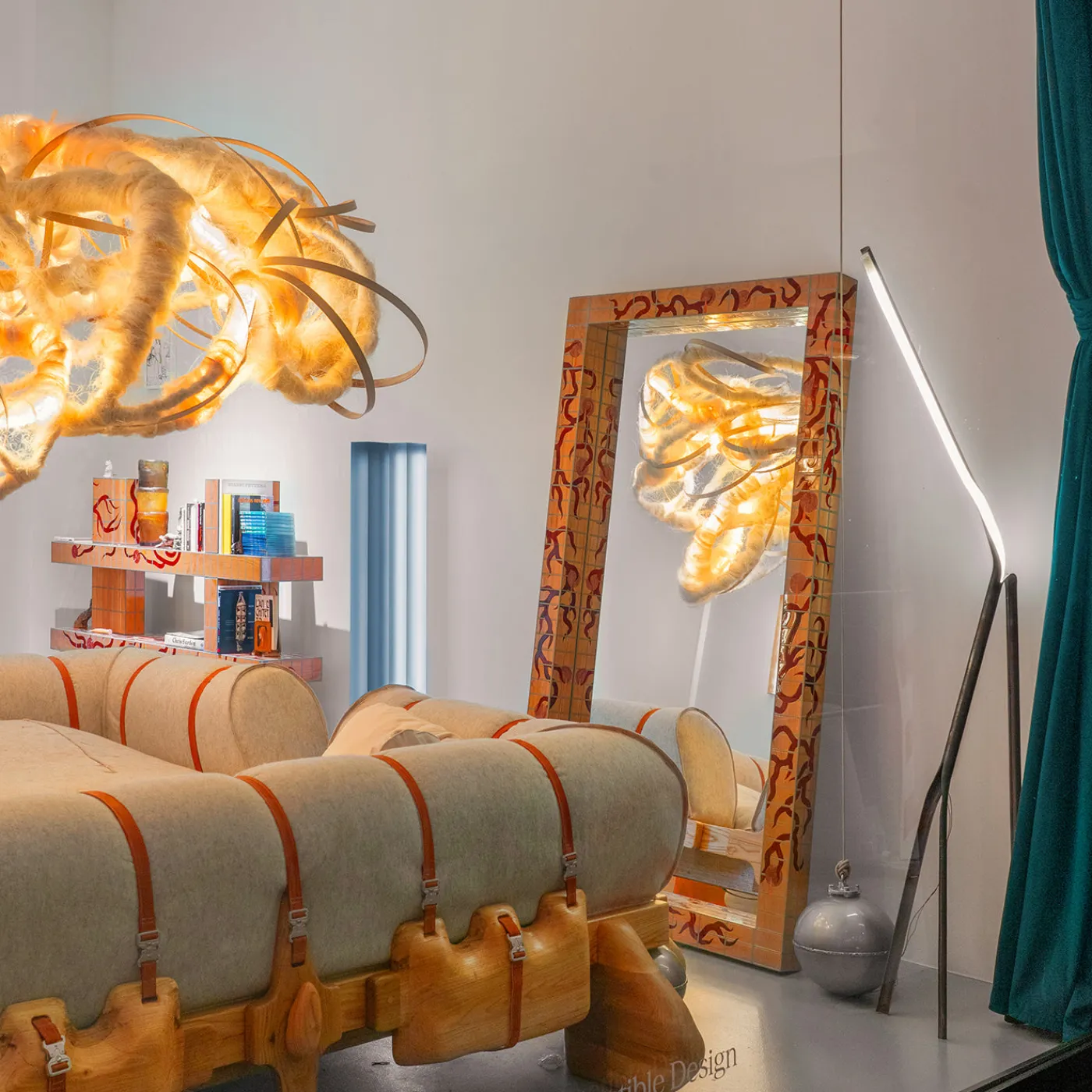 Lo specchio Orvalho di Laurids Gallèe si presenta come una scala a figura intera che incornicia l’osservatore all’interno di una griglia decorata, instaurando un dialogo tra persona e struttura. La sua composizione bilancia rigore geometrico e vitalità organica, con una trama intrecciata da viticci e frutti in crescita. La finitura lucida amplifica i riflessi, catturando e modulando la luce in modo sempre diverso, come un momento di maturità naturale sospeso tra ordine e spontaneità.
