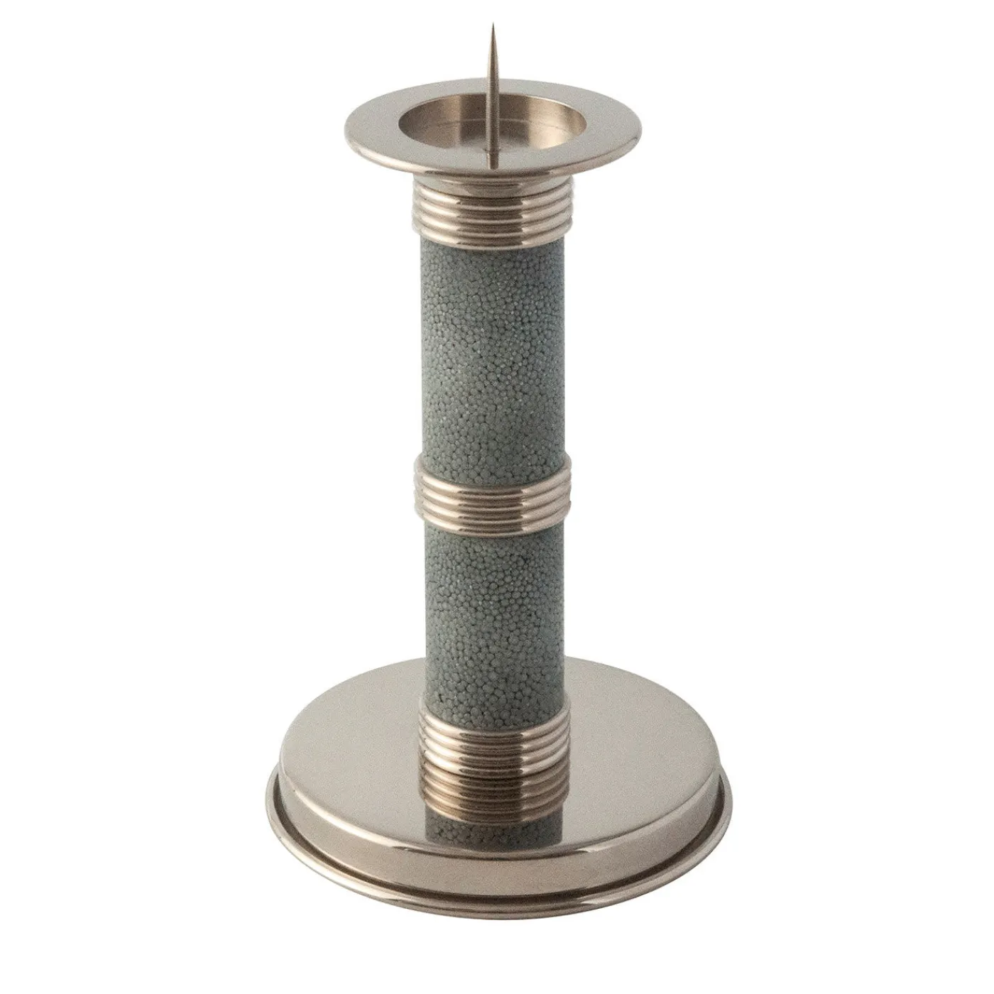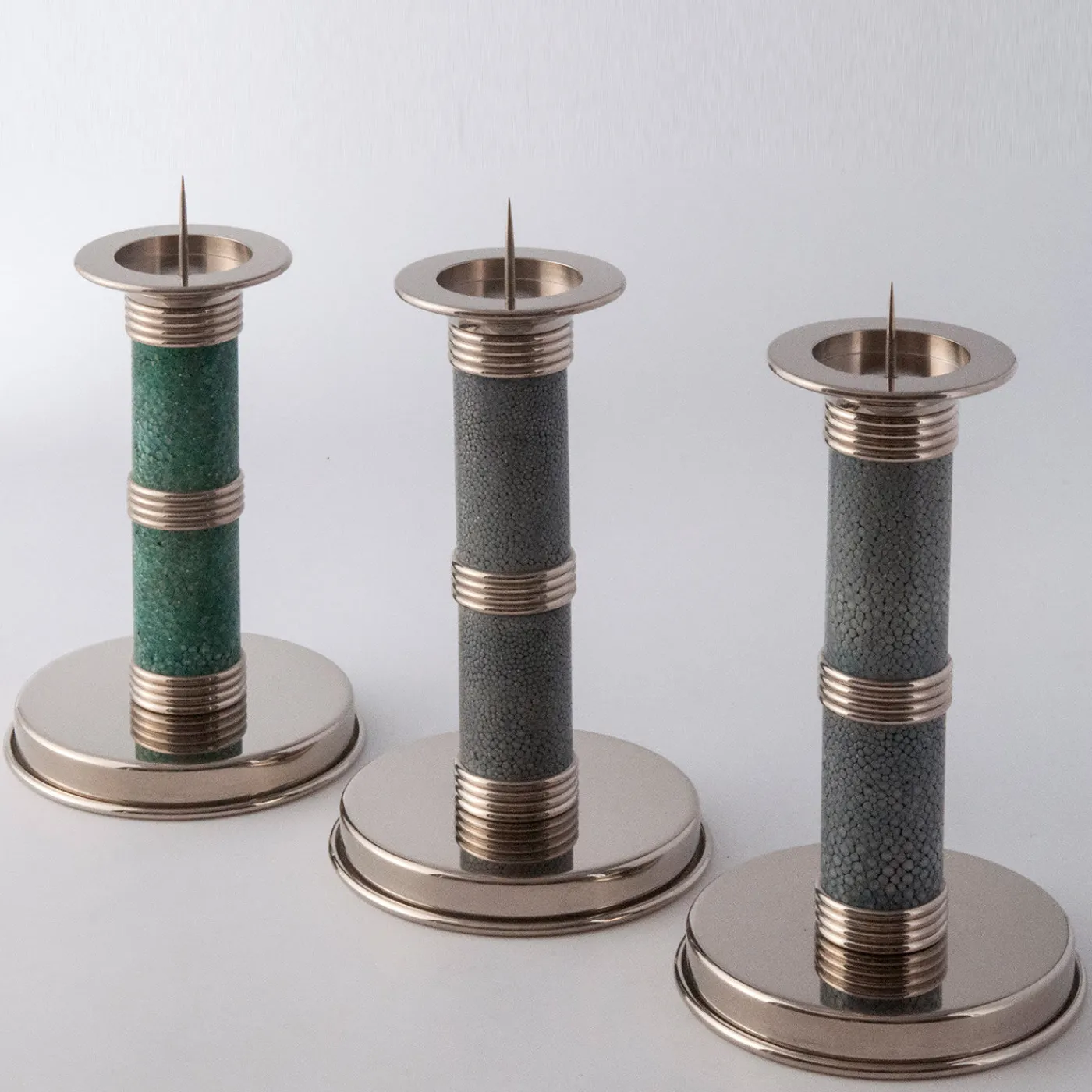 Un’accattivante silhouette ispirata all’Art Déco definisce questo raffinato candeliere che aggiungerà un tocco unico e un’estetica sofisticata a qualsiasi arredamento. Realizzato a mano in ottone nichelato lucido, questo pezzo presenta una base rotonda (Ø 11 cm) e uno stelo cilindrico decorato con tre anelli scanalati, marchio di fabbrica di Nino Basso, e rivestito in zigrino azzurro. Completo di coppetta (Ø 6,5 cm), questo candeliere è presentato in una lussuosa scatola con istruzioni dettagliate per la cura.