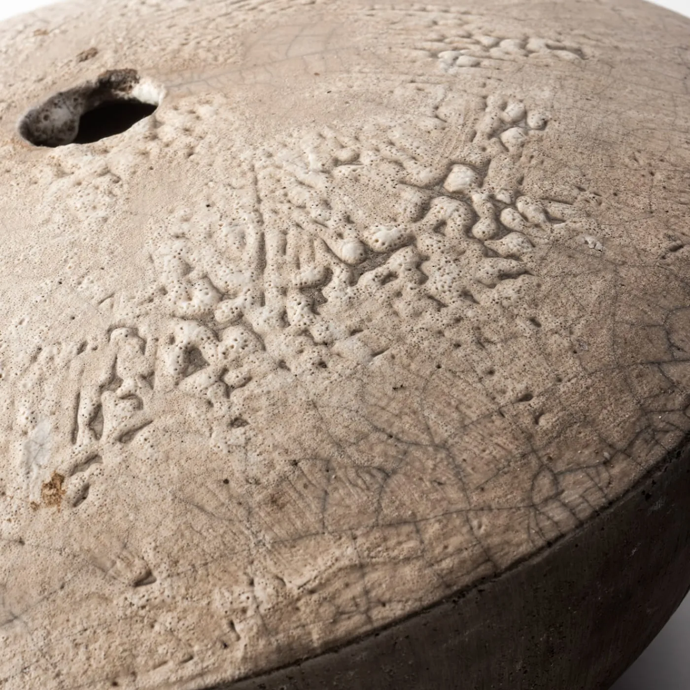 Attualizzazione del conflitto tra l’oscurità e la luce del giorno, questa scultura/vaso in ceramica sarà ugualmente adatta a esporre del verde secco o a stare da sola con una funzione puramente decorativa. È stata realizzata a mano dall’artista Nino Basso secondo il metodo giapponese raku, ottenendo una parte superiore più chiara e sporgente con una superficie strutturata che contrasta con il corpo semisferico accentuato in grigio antracite senza ossidi. Non smaltato per una sensazione di crudezza, viene consegnato con le istruzioni per la cura.