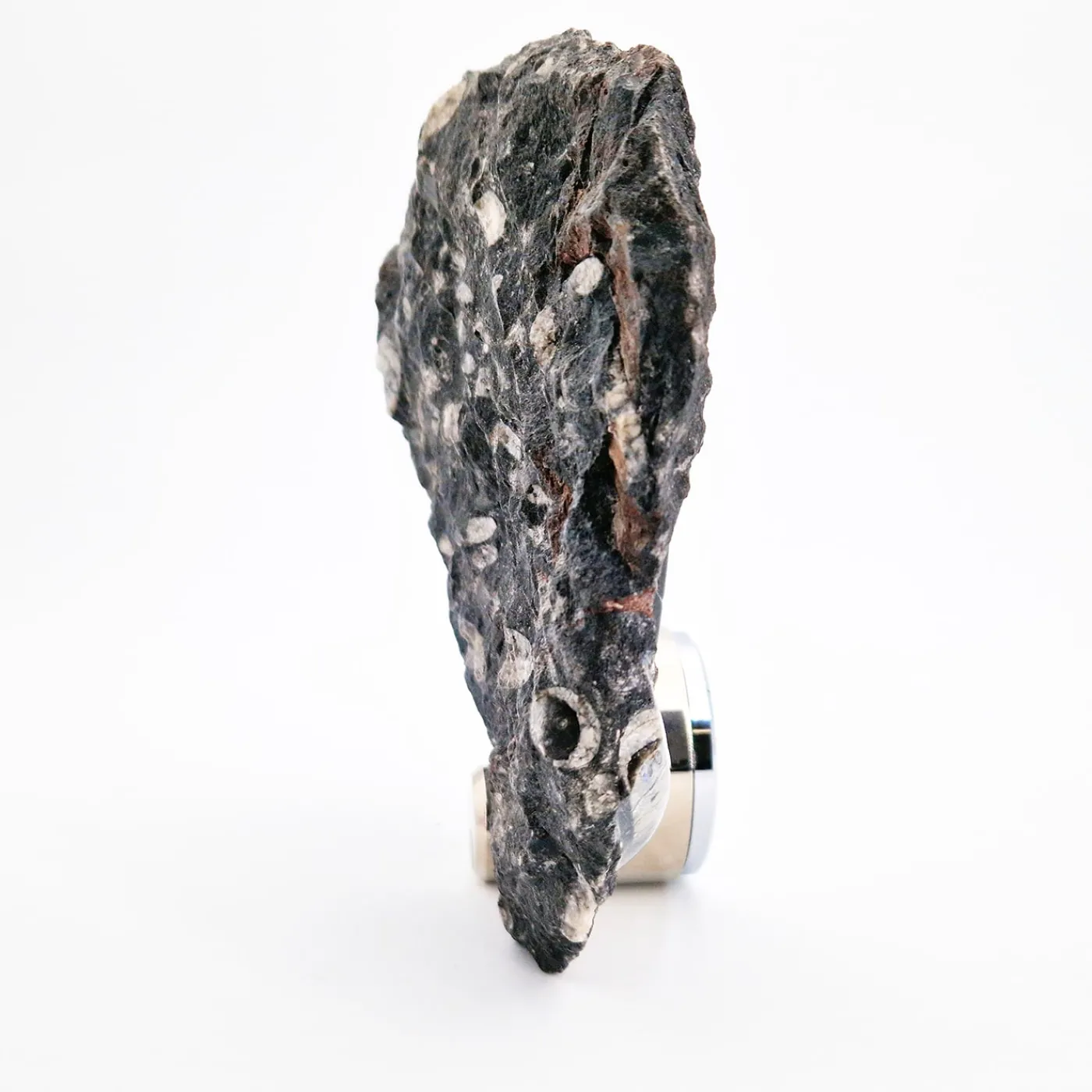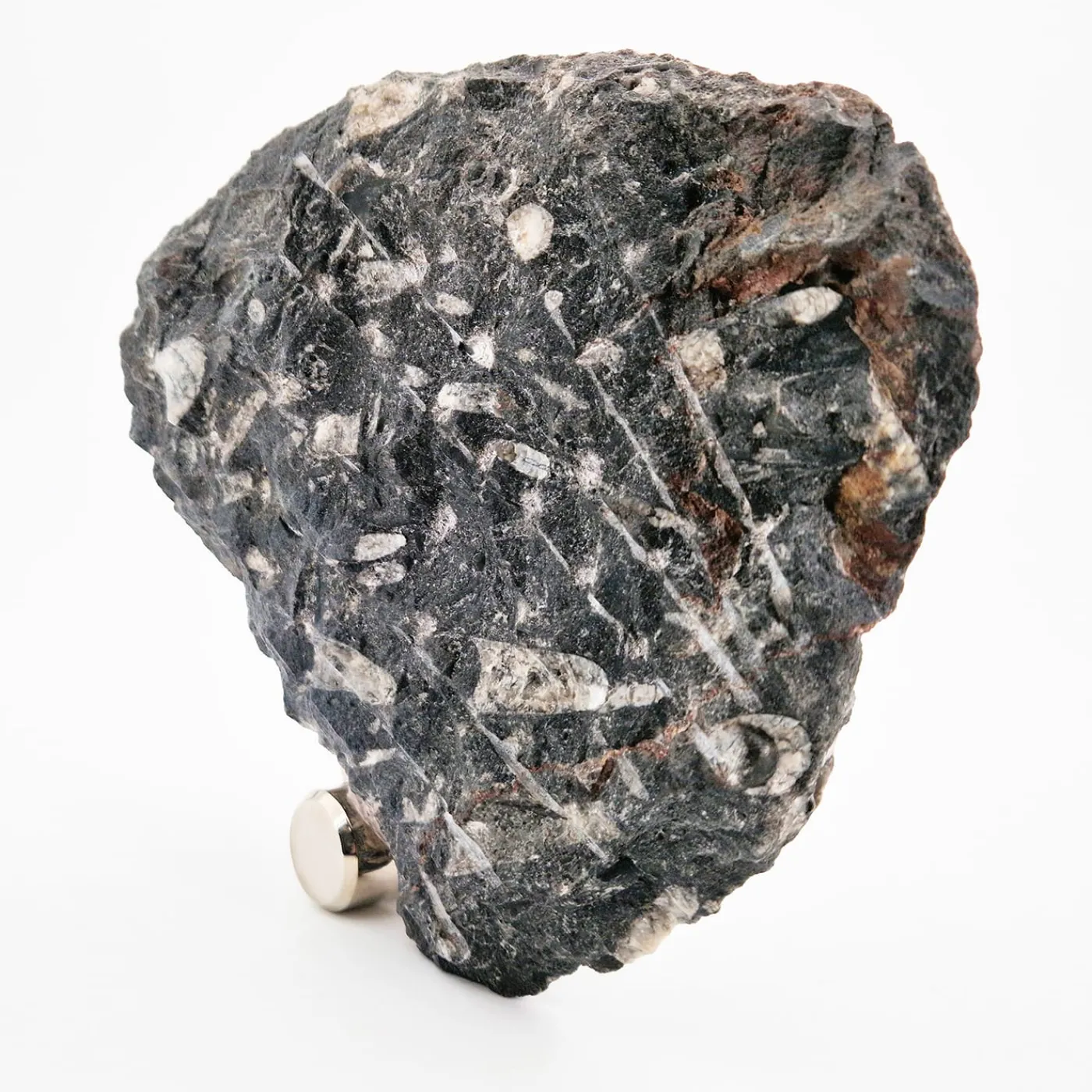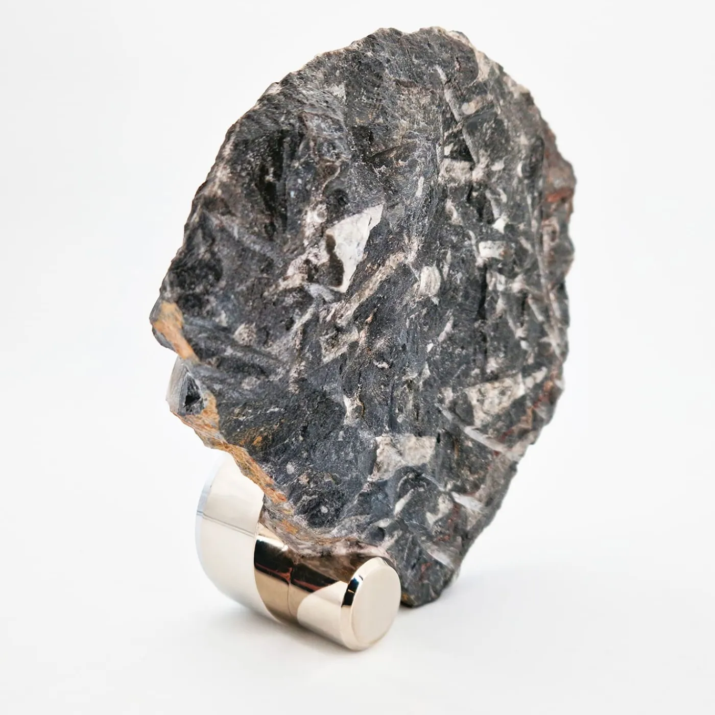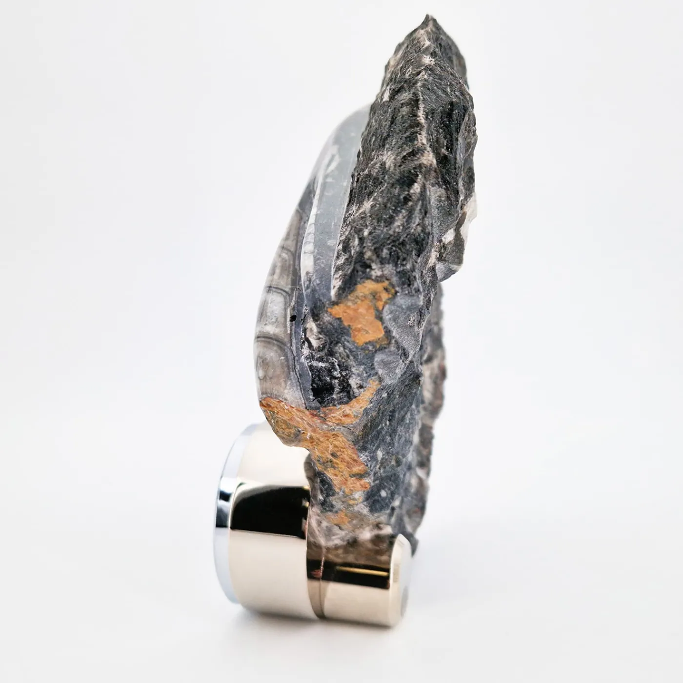 Affascinante testimonianza di 400 milioni di anni fa, il pezzo di pietra volutamente irregolare di questa scultura colpisce con autentici gusci fossili di ammonite. Questi fossili unici, che spuntano ordinatamente dalla pietra, fiancheggiano un elegante orologio al quarzo incastonato in un cilindro di ottone rifinito in nichel lucido che ospita anche il meccanismo. Le istruzioni per la cura e il certificato di autenticità sono inclusi nell’acquisto.