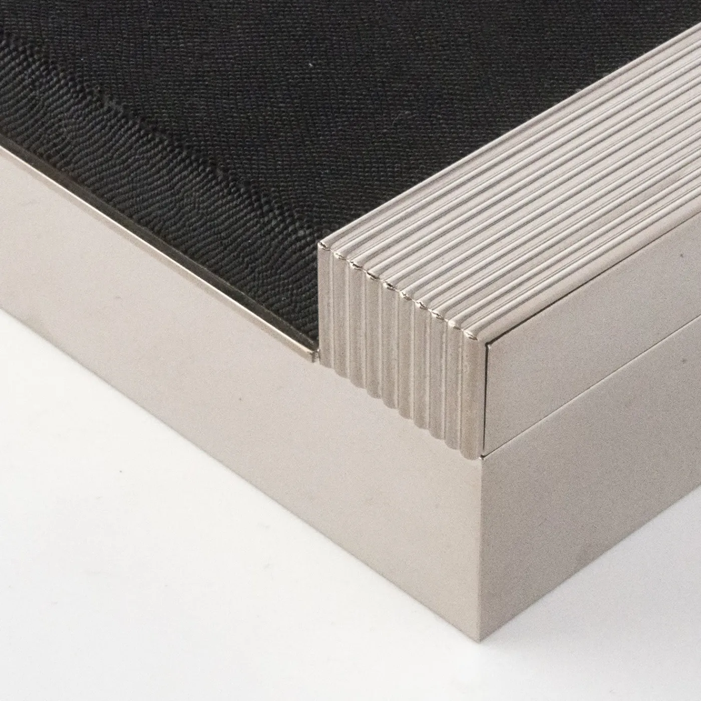 Un oggetto di lusso che completa qualsiasi arredamento, questa scatola moderna conferisce un carattere visivo ricco e invitante alla scrivania di uno studio privato, alla libreria o al tavolino da caffè. Sapientemente realizzato a mano in ottone con finitura lucida, questo pezzo raffinato presenta un inserto quadrato di vero zigrino nero sul coperchio scanalato. L’interno è in legno laccato. Scatola nera personalizzata (18x19xH.6cm) con foglietto di istruzioni per la cura incluso.