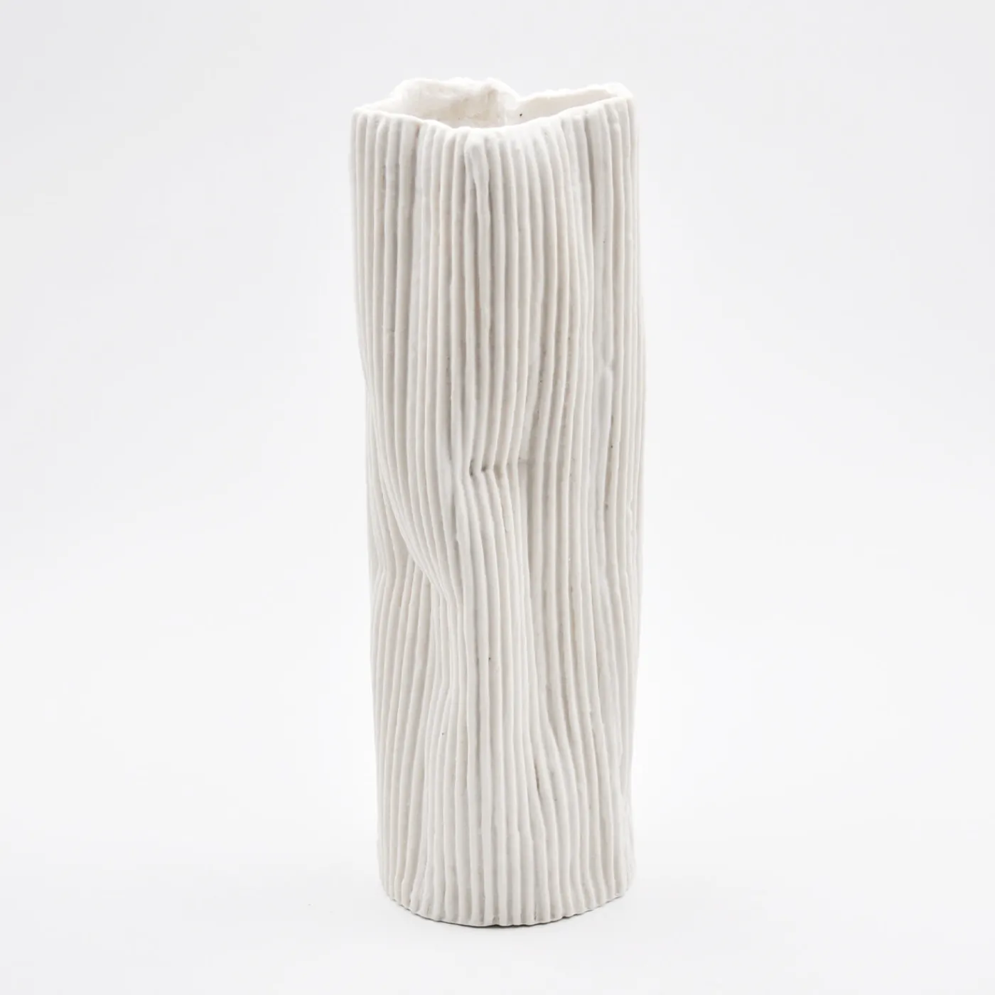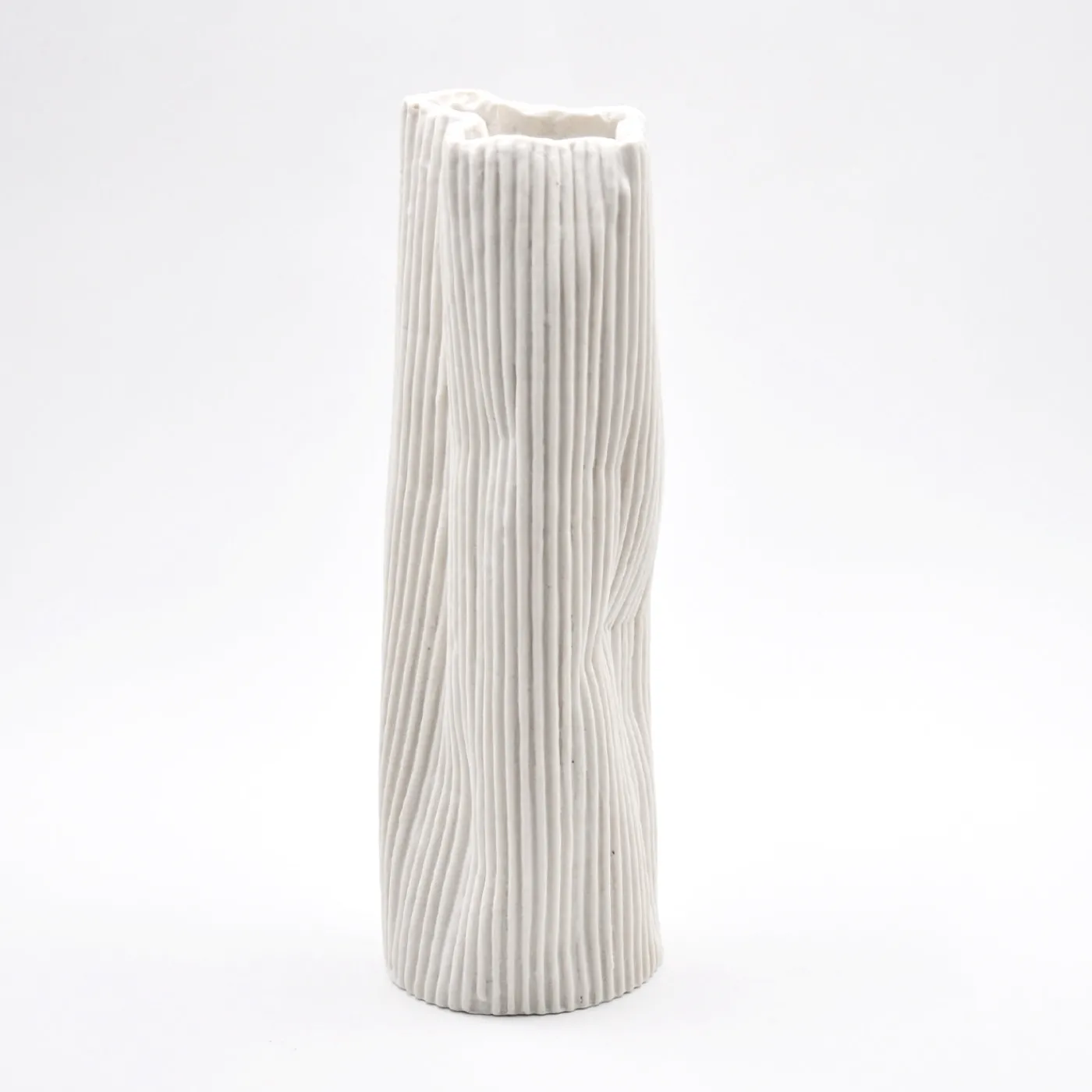 ChatGPT ha detto:Un vaso decorativo di medie dimensioni caratterizzato da sottili scanalature verticali che creano un raffinato gioco di luci e ombre, esaltandone la forma scultorea. Parte della collezione “Paesaggio sotto la luna”, presenta una superficie bianca pura con finitura naturalmente testurizzata e delicate ondulazioni formatesi durante la cottura, che aggiungono carattere e autenticità. Ideale per ambienti moderni, minimalisti o artistici, il vaso include una scatola protettiva, certificato di autenticità e istruzioni per la cura.