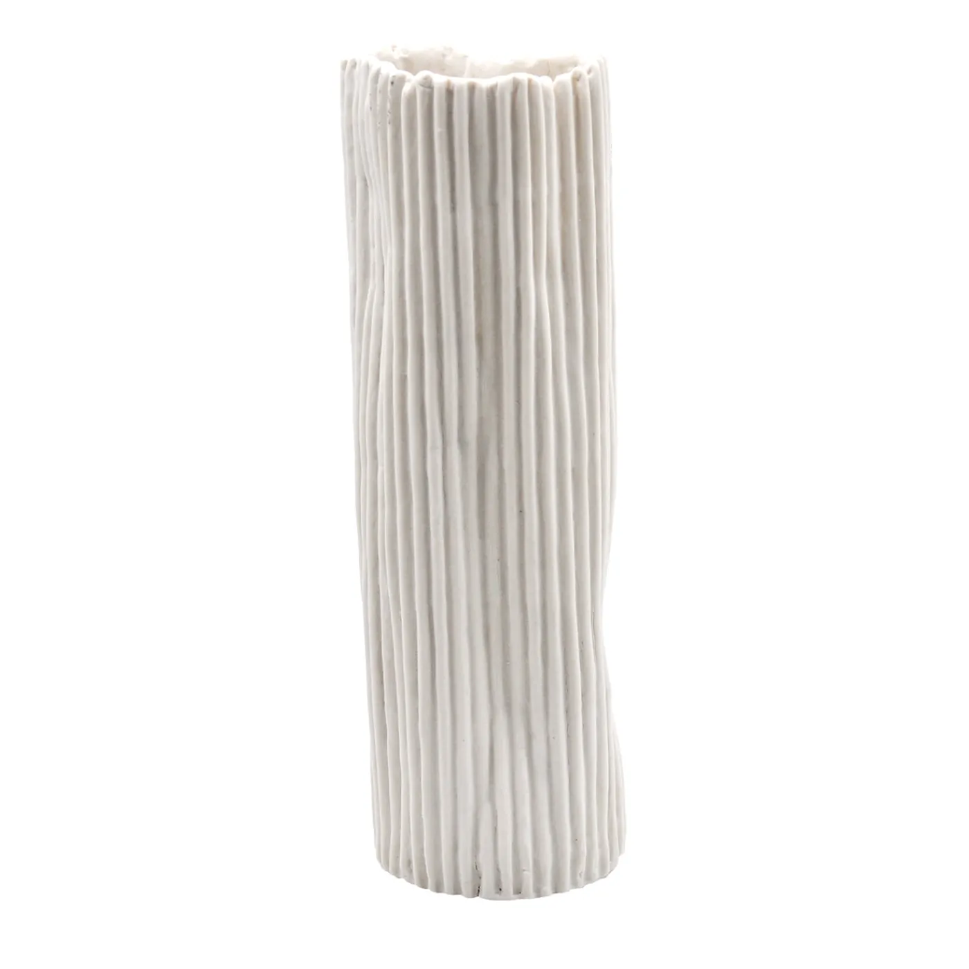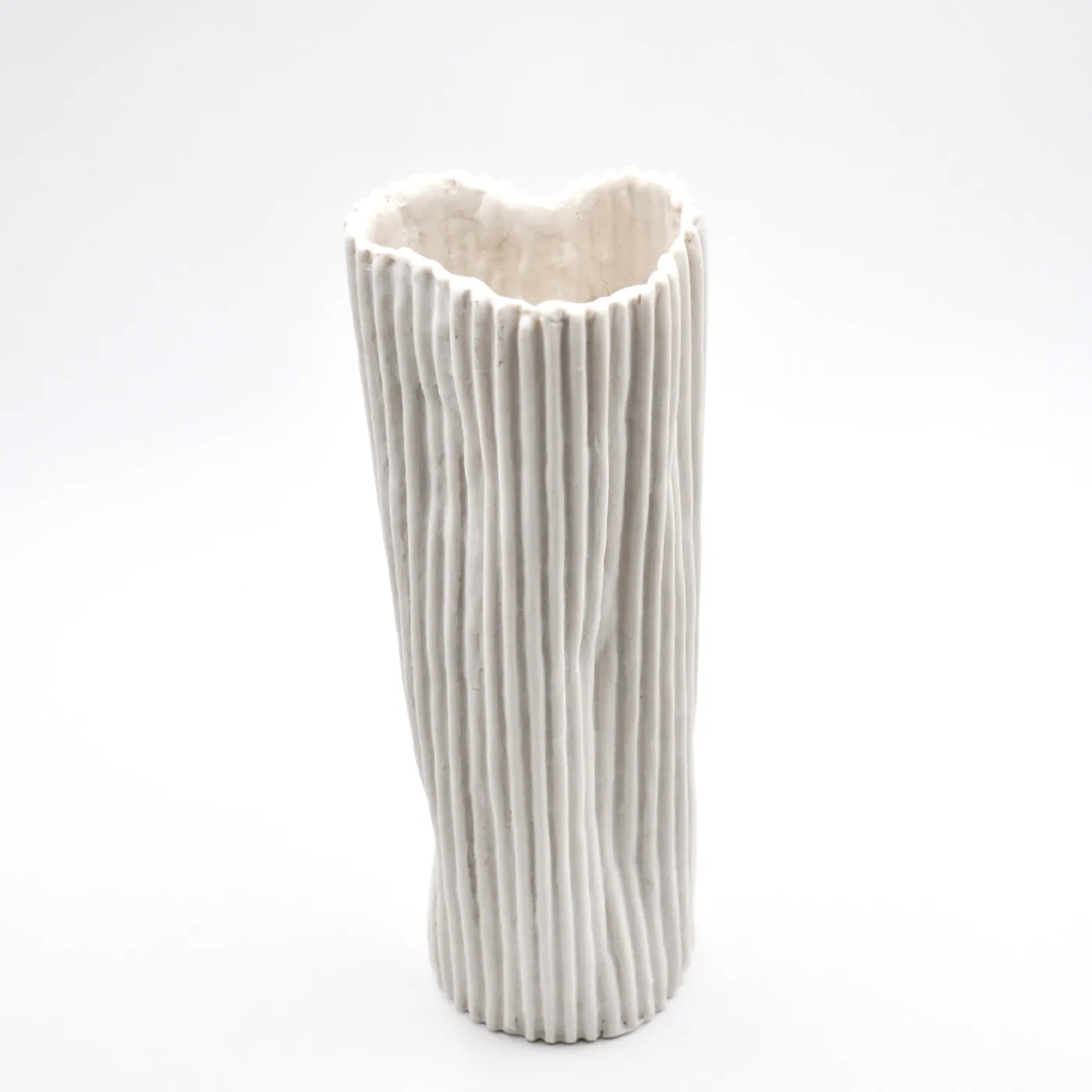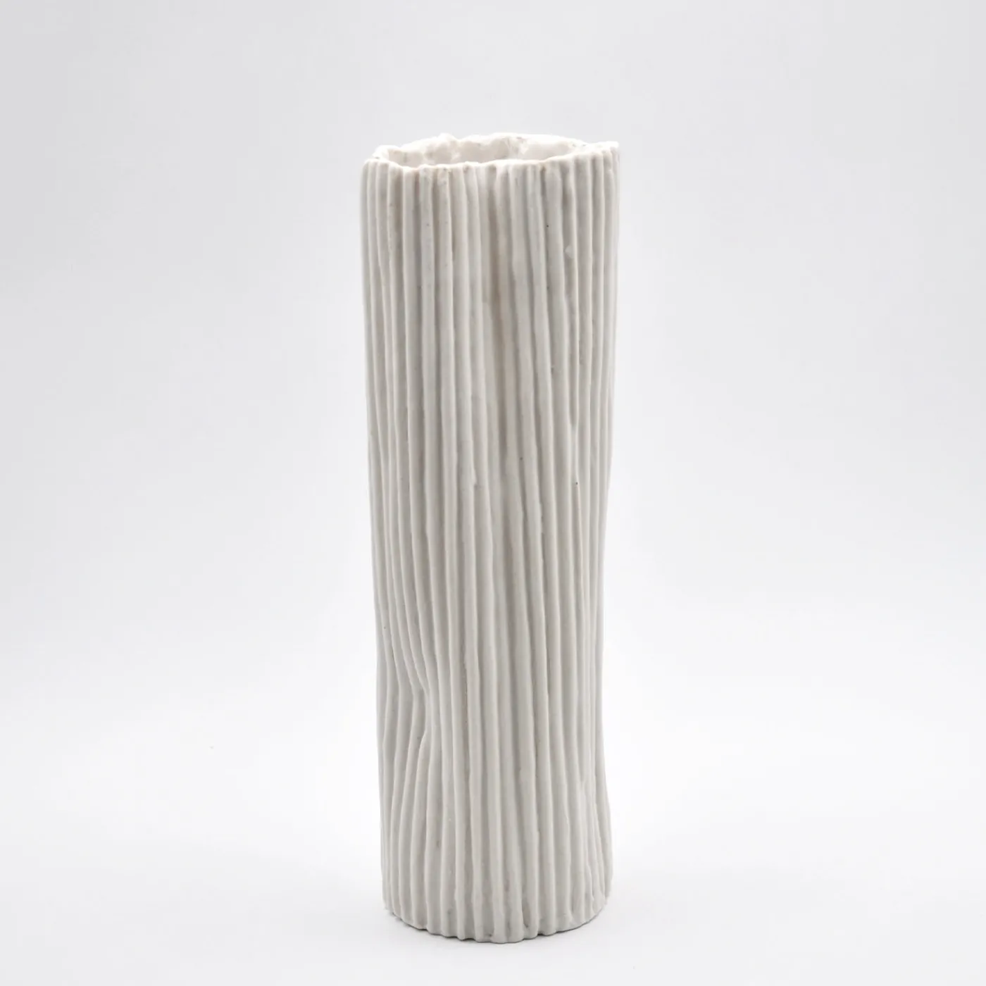 ll vaso Paesaggio 21 di Nino Basso presenta un design essenziale con una raffinata texture bianca e motivi ondulati verticali in rilievo. Realizzato con una tecnica unica che applica porcellana e fibre naturali su uno stampo monouso, la sua superficie rivela ondulazioni organiche formatesi durante la cottura, rendendo ogni pezzo unico nel suo genere. Il suo stile minimalista e sofisticato si integra perfettamente in spazi contemporanei. Include confezione, certificato di autenticità e istruzioni per la cura.