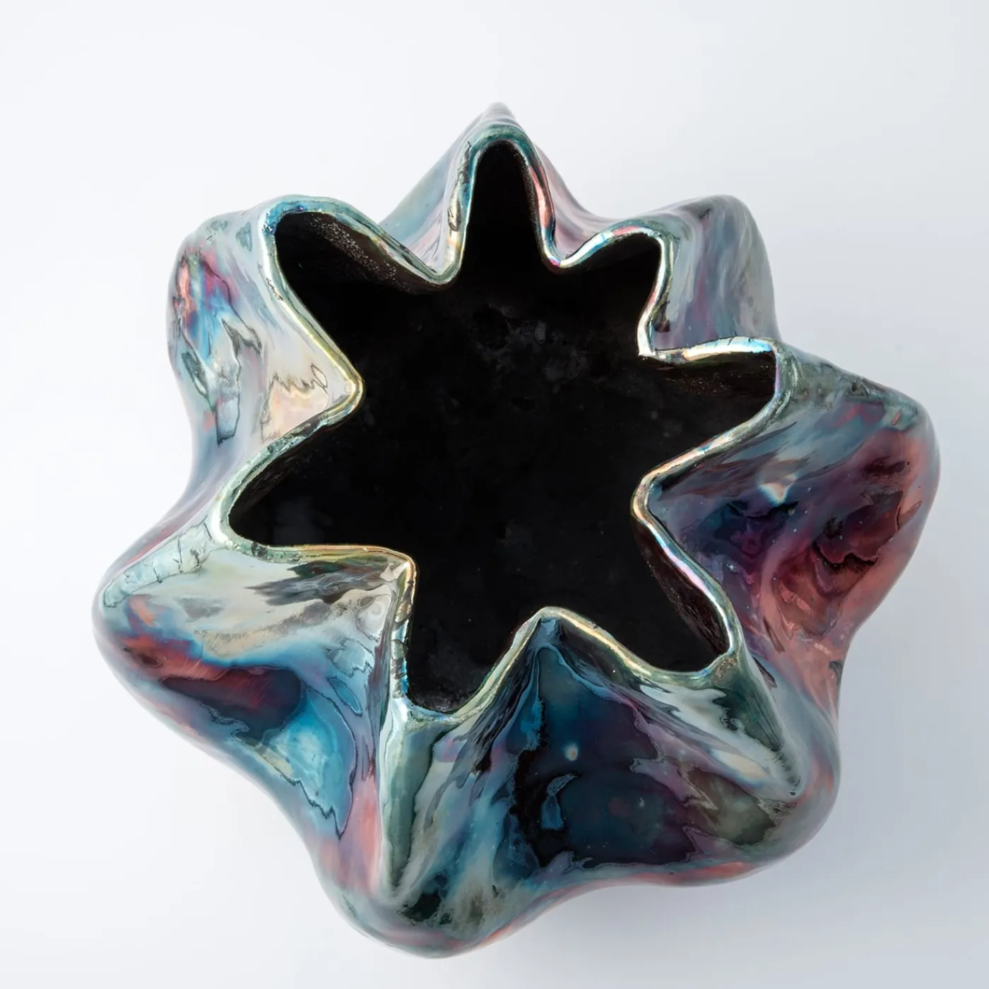 Disegnato da Nino Basso come una fresca reinterpretazione della tecnica giapponese Raku, questo vaso-scultura in ceramica colpisce ad ogni sguardo con la sua finitura metallica iridescente esaltata da una dinamica texture scanalata. Un trionfo di sfumature mutevoli che ricordano l’aurora boreale, ogni vaso è abilmente modellato a mano. La consegna include suggerimenti per la cura e un certificato di autenticità.
