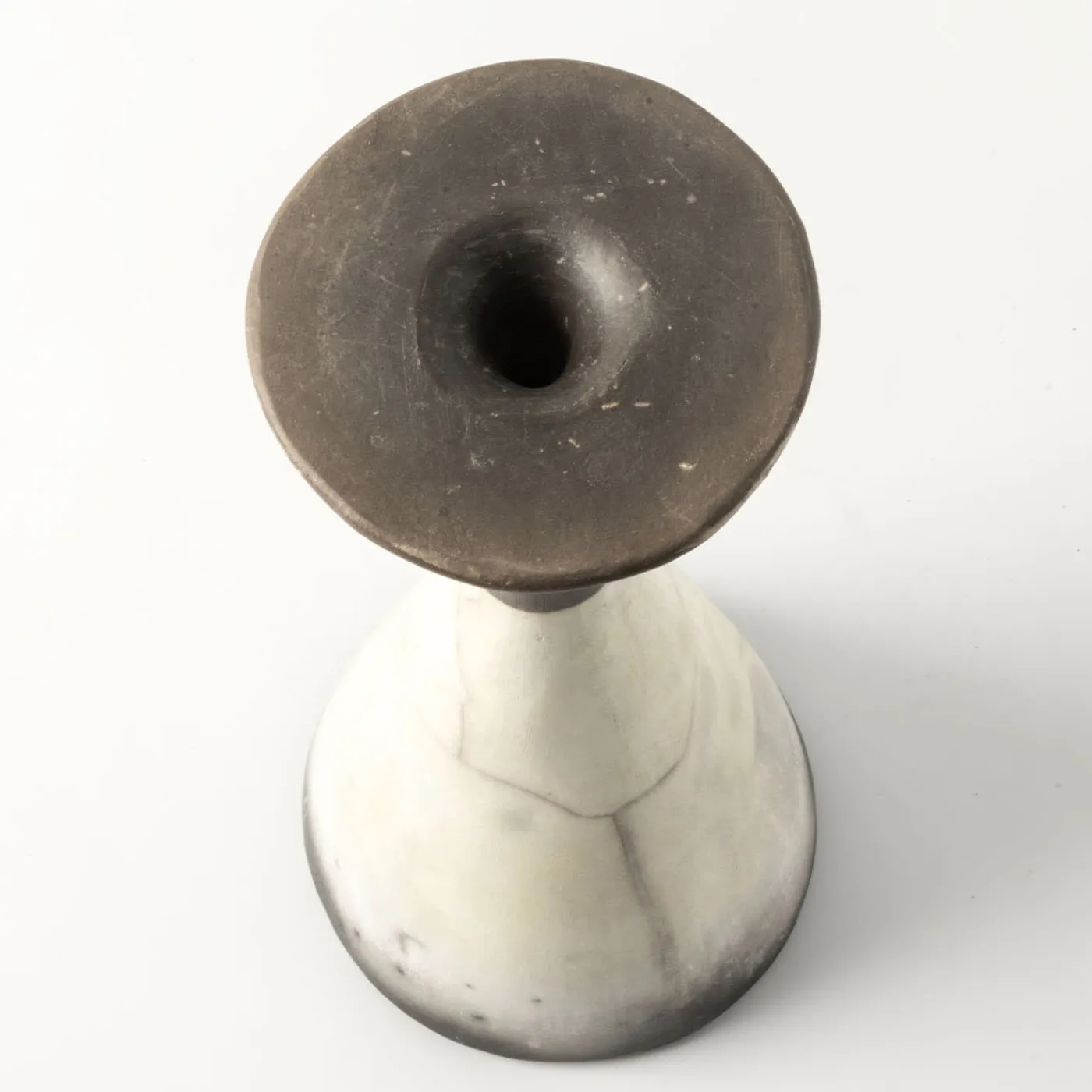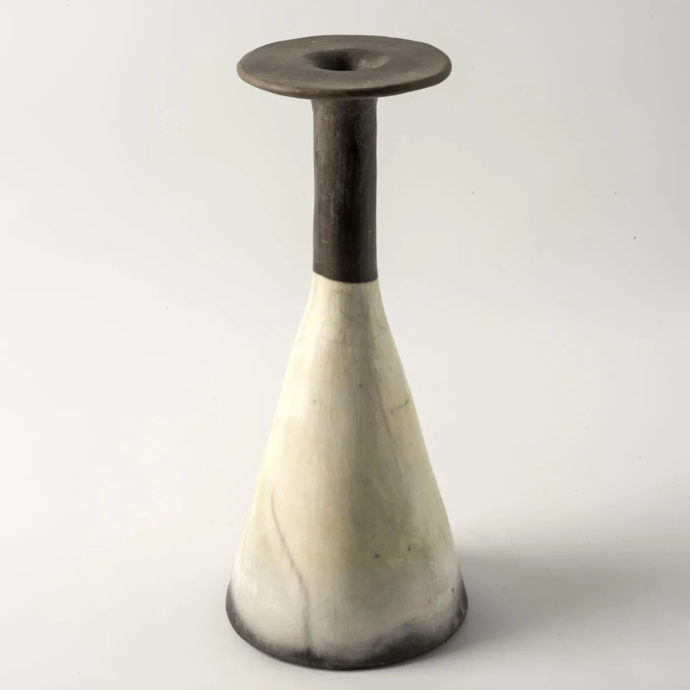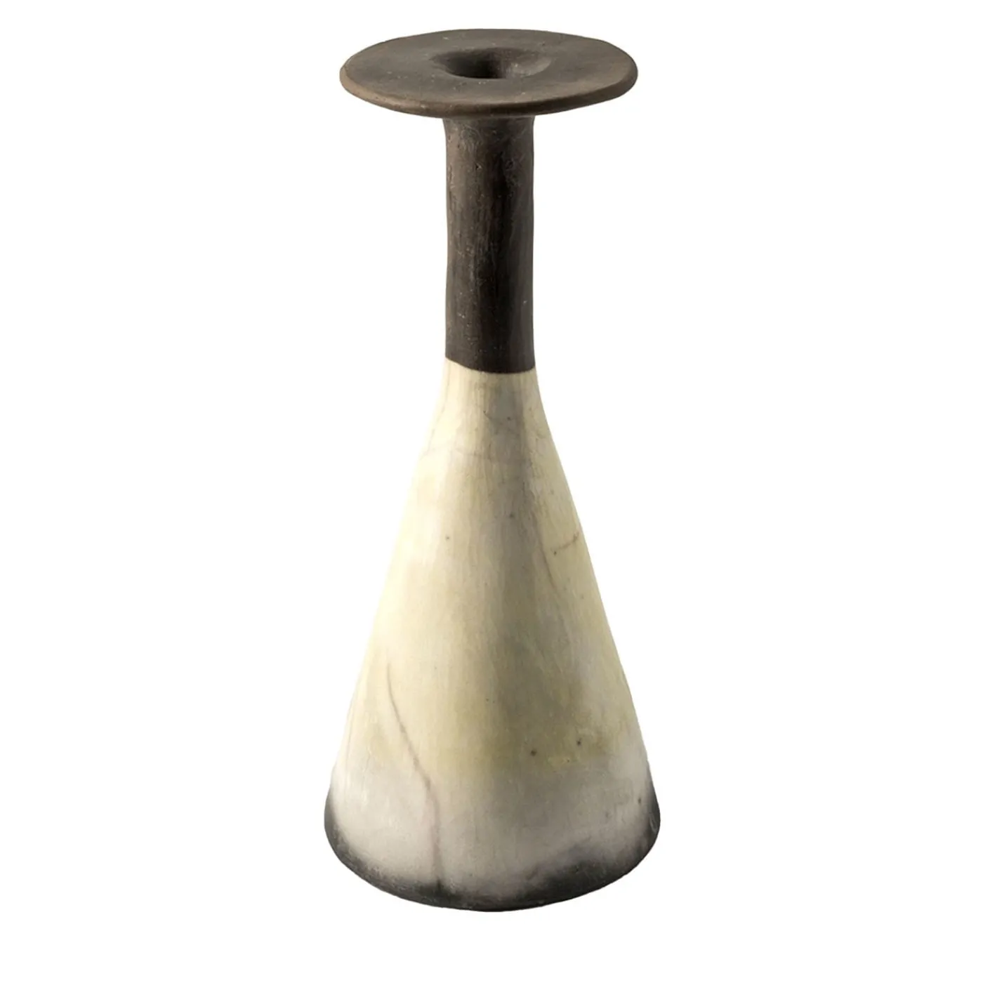 Concepito e modellato a mano dall’artista Nino Basso come una sofisticata sintesi tra un vaso e una scultura, questo progetto è stato realizzato seguendo la tradizionale tecnica giapponese del “Raku nudo”. Il corpo conico, che si restringe in un lungo collo non smaltato color grafite con una bocca audace che ricorda vagamente una tromba, incanta con le sue sottili sfumature di grigio e giallo. Ideale per accogliere fiori a gambo singolo, il pezzo è assolutamente unico.