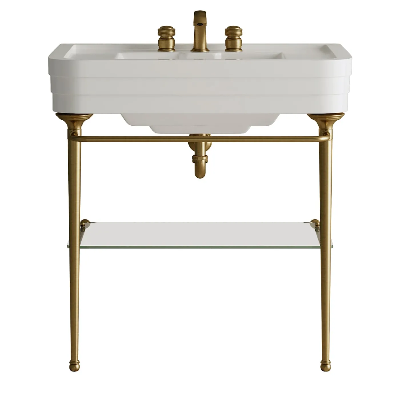 Una raffinata consolle che distilla l’estetica dell’architettura Art Déco e la rilegge all’insegna del comfort più esclusivo. La struttura in ottone, con terminali di appoggio con modanatura tripartita che richiamano la conformazione scultorea del lavabo in ceramica, include tre barre porta-asciugamani e una mensola porta-oggetti in vetro. La rubinetteria non è inclusa. Contattare il Concierge per ulteriori informazioni e opzioni.