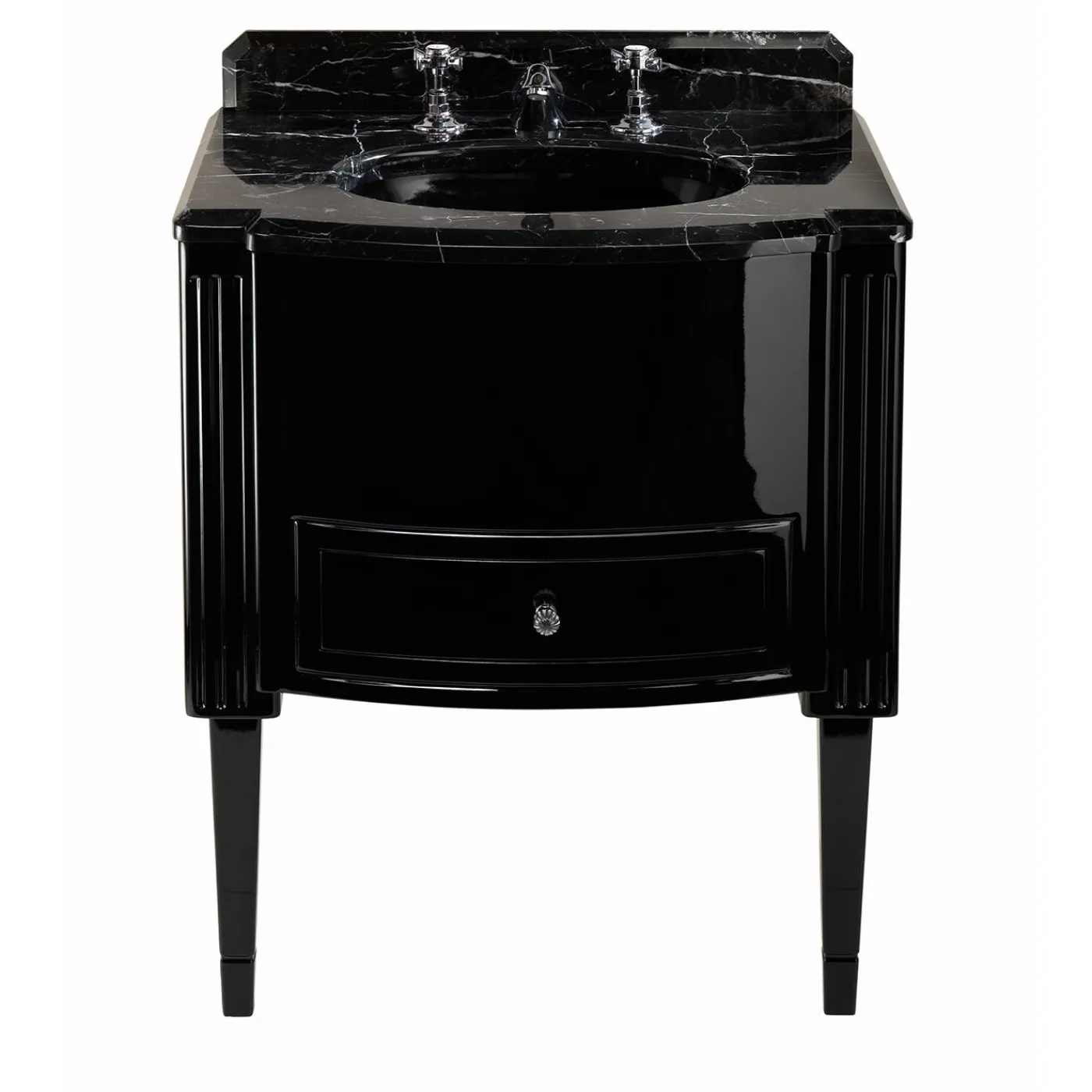 Domino reinterpreta con ironia l’aspetto degli armadietti per liquori per un mobile lavabo con gambe tronco-piramidali che rimandano allo stile americano degli anni Quaranta. Il piano è in marmo pregiato. La base, con cassetto portaoggetti, è disponibile in altri colori; per ulteriori informazioni, contattare il concierge.