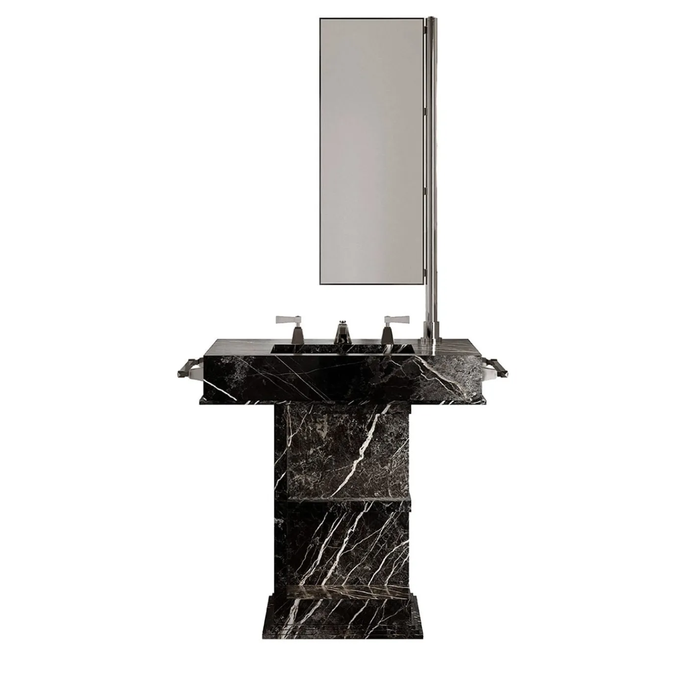 Un mobile compatto in gres porcellanato effetto marmo, nella variante cromatica Port Laurent, realizzato con l’innovativa tecnologia ALL-OVER che garantisce la perfetta continuità visiva delle superfici e un effetto materico estremamente realistico. A parete o freestanding, il modulo incorpora il lavabo, quattro mensole portaoggetti, il portasciugamani e lo specchio orientabile a 90° in ottone cromato. La rubinetteria non è inclusa.