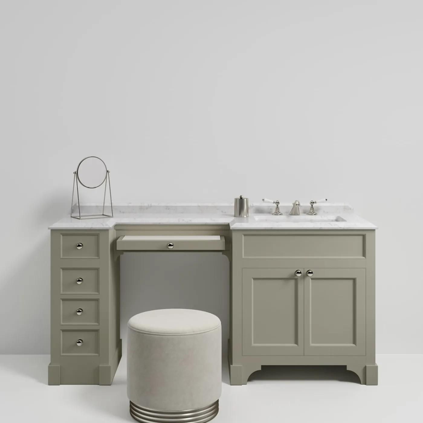L’iconico mobile da toilette neoclassico è dotato di un tavolo da toeletta con quattro cassetti e un piano in velluto pieghevole. Ideale per chi desidera trasformare anche lo spazio più compatto in un esclusivo e lussuoso rifugio di bellezza, Season Vanity è il risultato di una lavorazione impeccabile e dei migliori materiali. Disponibile in diverse finiture su richiesta. Per ulteriori informazioni, contattare il servizio Concierge. La rubinetteria non è inclusa.