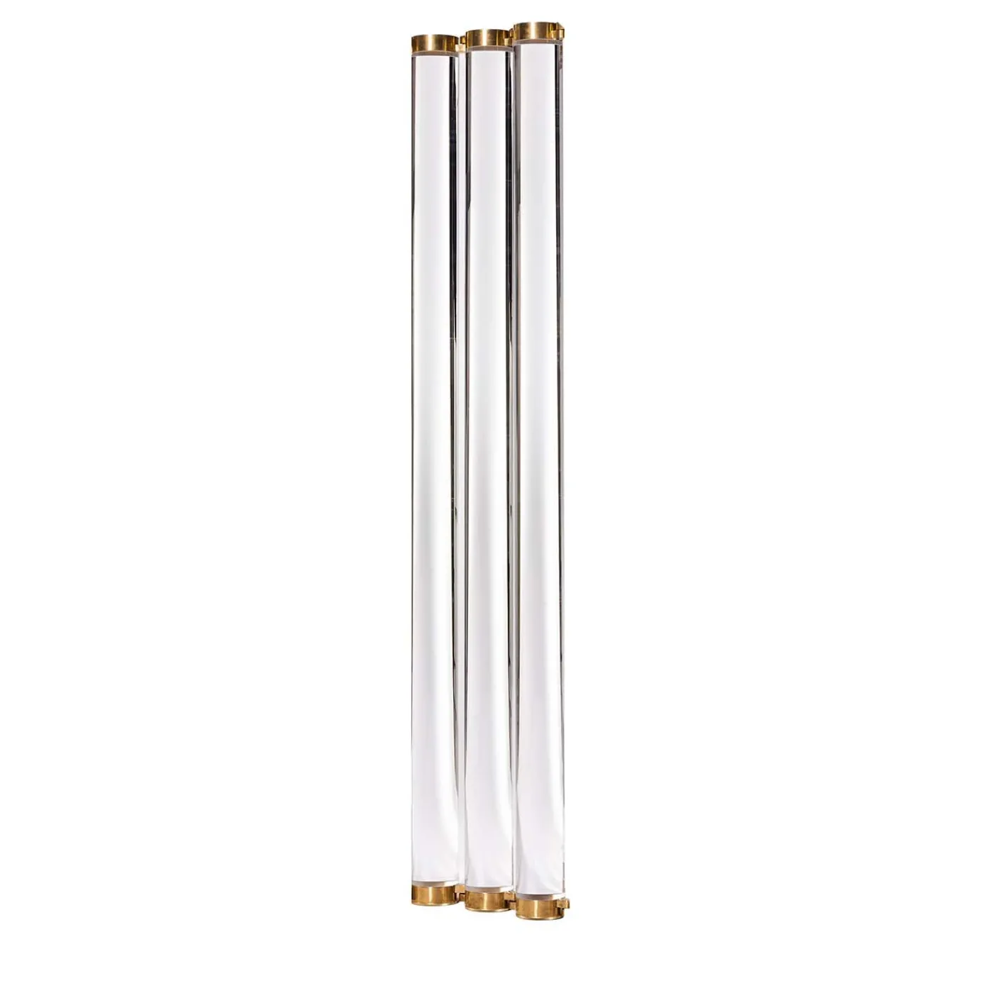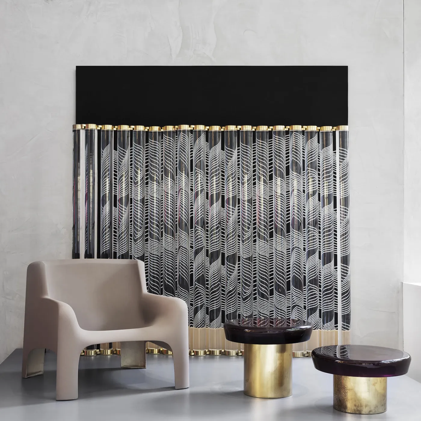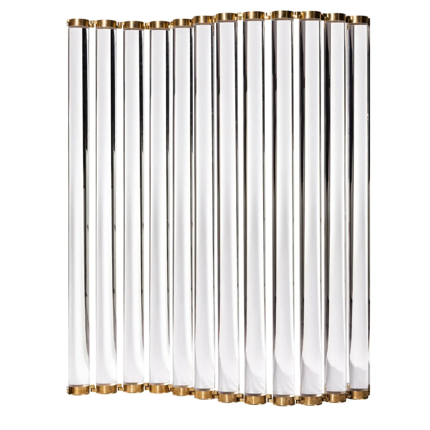 Concepito come un separé modulare, Vertigo è una multi-composizione ondulata di barre cilindriche in lucite connesse tramite ganci in ottone. Ruotando gli elementi ad incastro, la disposizione ricrea un’onda che conferisce un senso di dinamismo, che può essere ulteriormente accentuato posizionando, dietro alle barre di resina incolore, dei tessuti con grafiche optical dipinti a mano nel nostro atelier.
