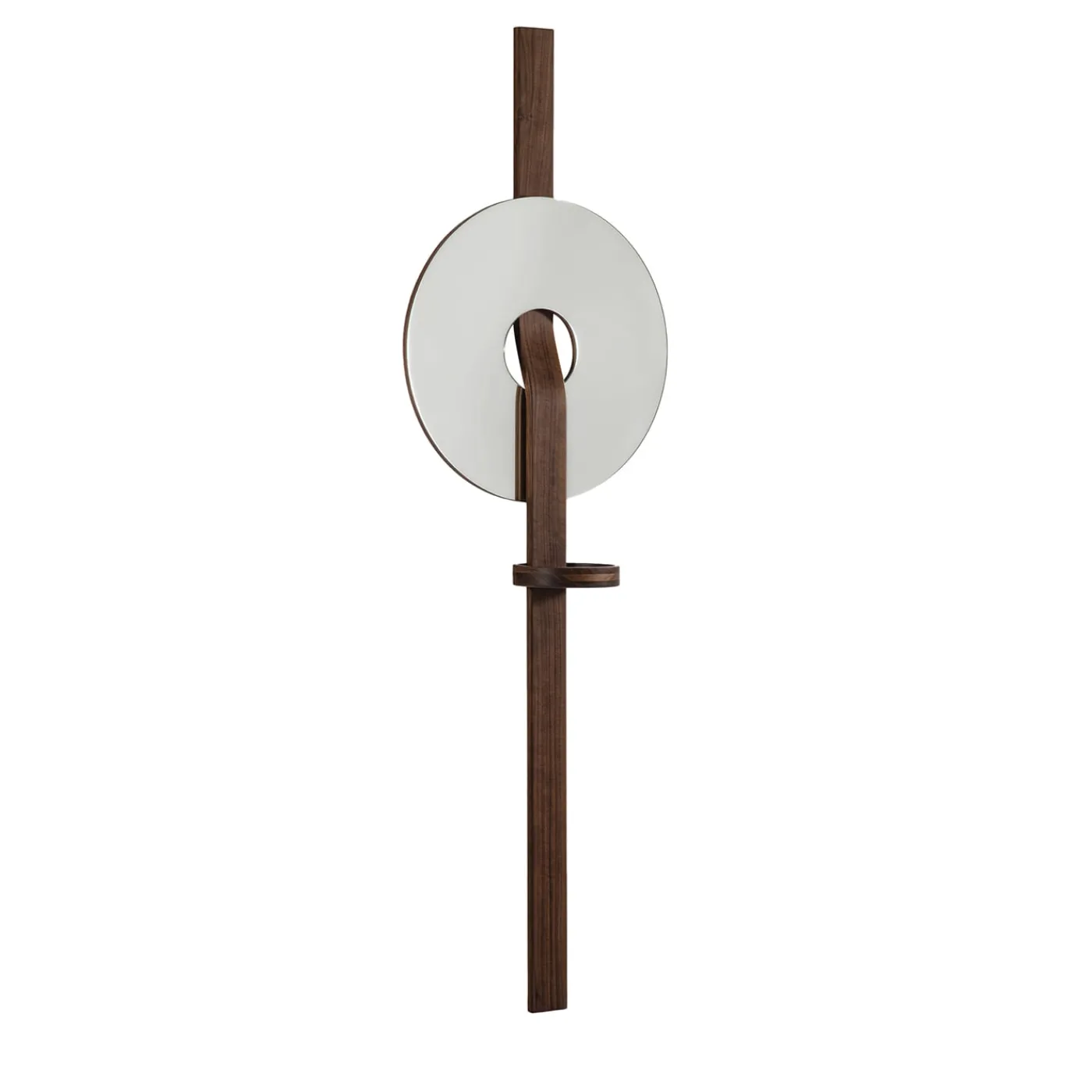 Questo specchio da parete è un trionfo di volumi geometrici disposti in una composizione scultorea di inconfondibile ispirazione contemporanea. L’elemento in vetro specchiato a forma di disco è trafitto dalla fascia leggermente curva in massello di noce canaletto che svolge una funzione strutturale essenziale. Il piccolo vassoio incorporato completa il design.