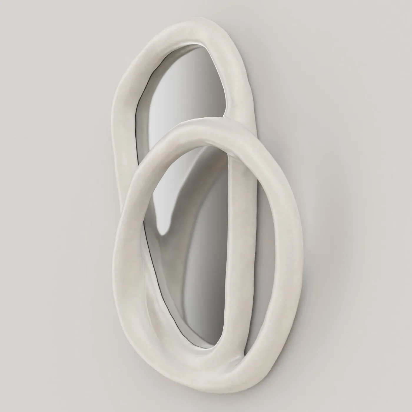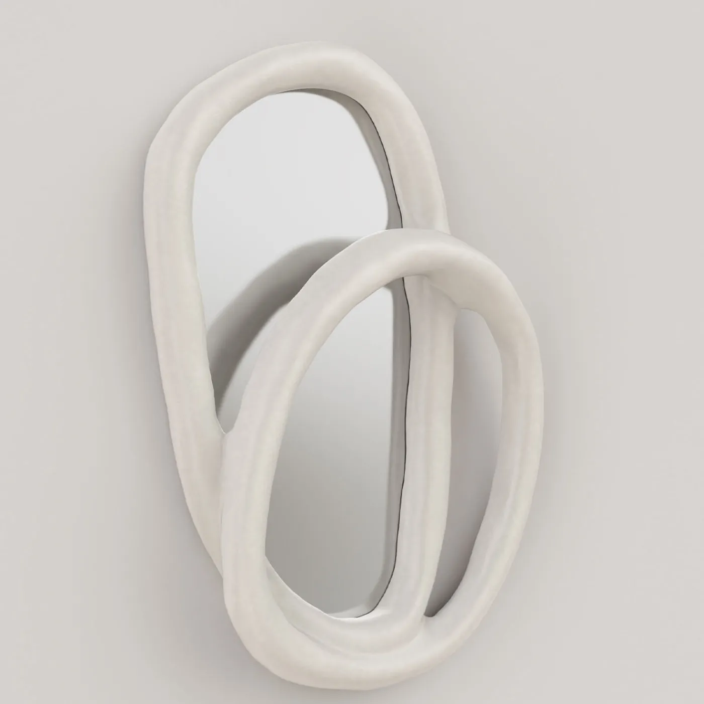 Specchio da parete di grandi dimensioni con cornice tridimensionale dal forte impatto scultoreo. Il design presenta un anello avvolgente che si sovrappone a sé stesso, estendendosi dal muro per un effetto dinamico e raffinato. La cornice, realizzata a mano con più strati di stucco, offre una superficie irregolare e materica, conferendo al prodotto un’estetica esclusiva e tattile.