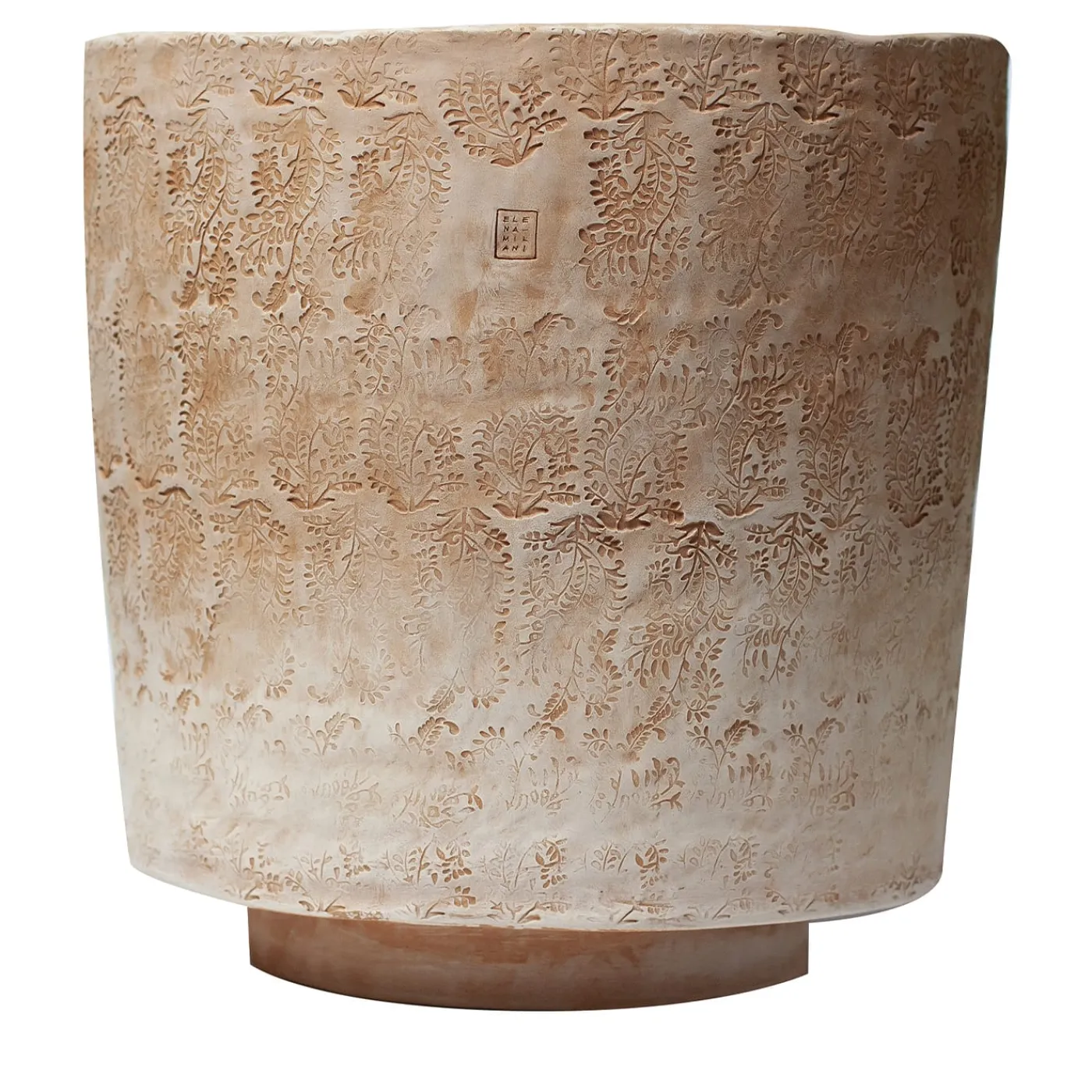 Vaso in terracotta realizzato con la tecnica della bobina, caratterizzato da una delicata texture a impronta floreale. La superficie mostra infiorescenze minerali naturali biancastre su una terracotta rossa e calda, unica per ogni pezzo. Progettato per uso interno ed esterno, favorisce l’aerazione delle radici e impedisce il ristagno dell’acqua grazie alla sua natura porosa. Dotato di una base rialzata per proteggere le superfici senza bisogno di un sottovaso, questo vaso decorativo combina il fascino classico della terracotta con elementi di design distintivi.