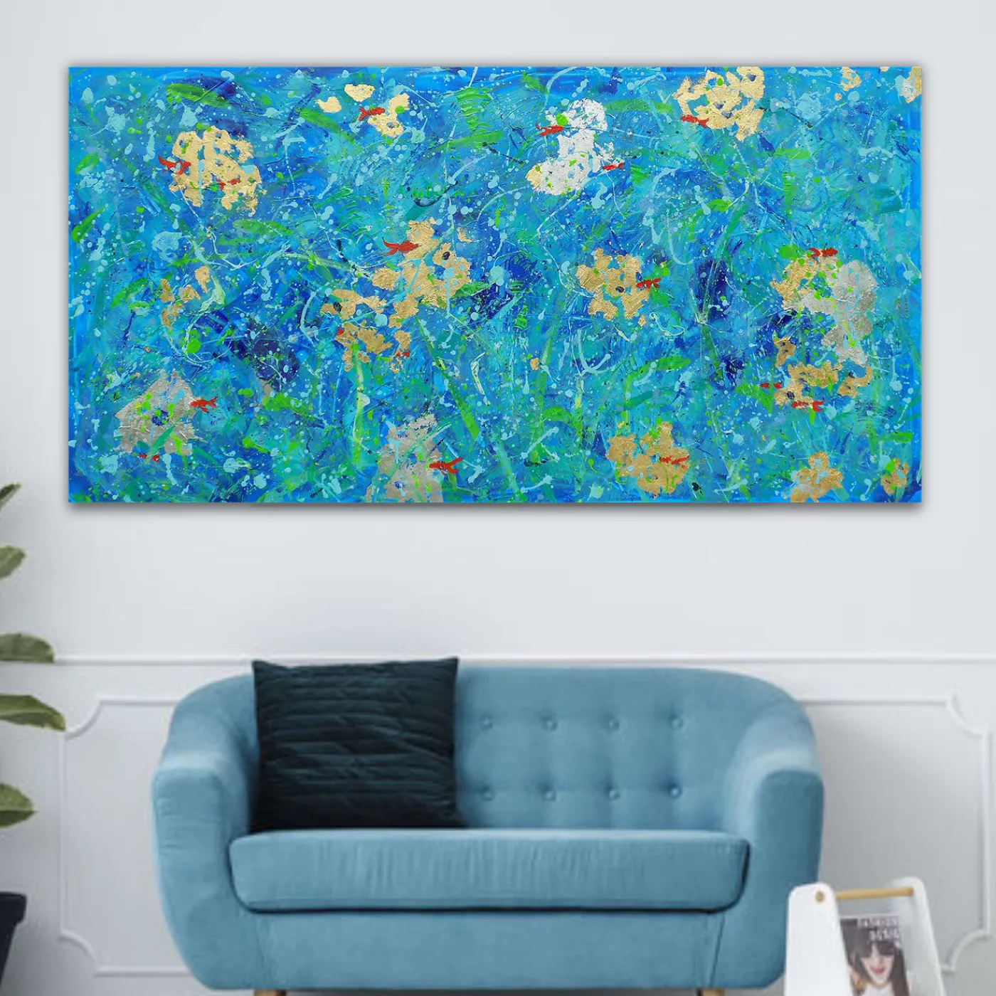 Questo dipinto in acrilico, grazie alle sue tonalità vivaci, sarà una dichiarazione unica e accattivante in un interno contemporaneo. Interpretazione astratta di un fiume in cui vivono pesci rossi, l’opera è arricchita da foglie d’oro e d’argento che evocano i riflessi abbaglianti del sole sulla superficie dell’acqua. Singolare opera d’arte luminosa e simbolica, è personalizzabile nelle dimensioni su richiesta, con una variazione di prezzo ed eventualmente di caratteristiche. È disponibile con o senza cornice.